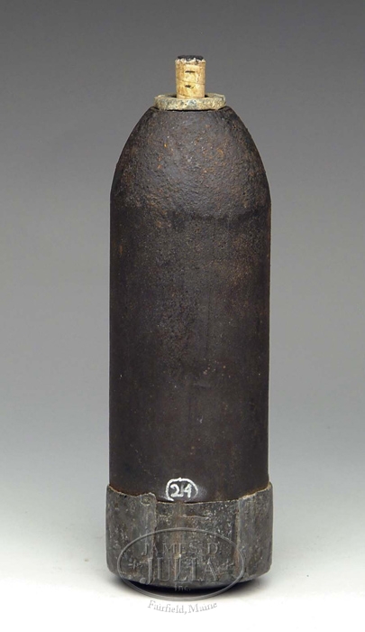 US 10-POUNDER EXPERIMENTAL PARROTT SHELL. Non- excavated. Unfired. Only one known to exist. Has an authentic zinc Parrott time fuse (not orig to this shell). This bolt is the exact projectile pictured on page 253 of the book, Introduction to Field Artillery Ordnance: 1861-1865 by Melton & Pawl. This shell came from the former Frankford Arsenal Museum. CONDITION: Near mint condition. 4-55869 JM53 (900-1,500)