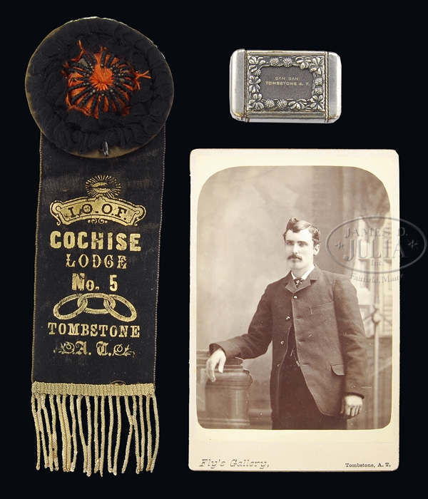 WONDERFUL, HISTORIC TOMBSTONE ARIZONA TERRITORY LOT INCLUDING EXTREMELY RARE, DOCUMENTED, SAMUEL L. HART MARTIALLY MARKED COLT SINGLE ACTION ARMY REVOLVER & EXTRAORDINARILY RARE TOMBSTONE “PATTON & CO.” DOUBLE LOOP HOLSTER. SN 111602. Cal. 45 Colt. In the annals of Western History very few incidents have been so repeatedly portrayed, both in print & movies than the event that occurred Oct. 26, 1881 in Tombstone, Arizona, “The Gun Fight at the OK Corral”. This famous shootout was between the three Earp brothers & Doc Holliday who were loosely considered law enforcement in Tombstone and the Clanton Brothers, McLaury Brothers & Billy Clairborne who were outlaw gang members of a loose confederation in the Tombstone area known as “The Cowboys”. At the time of the shootout there was only one gunsmith shop in the area and that was the Hart Gun Shop owned by Samuel Lombard Hart, a former Civil War soldier, who had his shop on Fremont Street, across the street from the O.K. Corral, in Tombstone from about 1880 to about 1890. Mr. Hart apparently marked all of the arms he sold with small hearts accompanied by the initials “SL”. Very few Colts are known, probably only five, with, most likely only this one still being in orig configuration without shortened bbls. The subject Colt Single Action Army revolver is an orig “DFC” (David F. Clark) inspected cavalry model with 7-1/2″ bbl, full front sight and 1-line block letter address. Left side of frame has 3-line patent dates with a small “U.S.” which is overstamped with a heart over each letter and tiny initials “SL” above each heart. Fitted with 1-pc walnut grip which has the last four digits of serial number in the back strap channel. Left side of grip has rudely scratched initials “E.C.G.R.” which stands for Edward C. Griswold Robinson who married Ruth Hart, the daughter of Samuel Hart. Right side of grip is marked with large crude initials “D.R.” which stands for Dorothy Robinson, Edward & Ruth’s daughter. Revolver has the “DFC” inspector initials in the usual places on the frame, bottom of bbl & cylinder with the grip cartouches either never stamped or worn away. The trigger guard & butt strap have tiny “G” (Capt. John E. Greer) inspector initials. Fitted with third type ejector rod housing and a bull’s eye ejector rod head. This revolver was produced in the period Aug. 1882 – Apr. 1883, which was during the Indian War period on the Western Frontier and certainly could have and likely did see service during that period. This revolver is accompanied by an extraordinarily rare, possibly one of a kind, orig dbl loop holster. It is made from one piece of leather which measures about 6″ at widest point of the skirt and is overall about 11″ long with two 3/4″ loops. Skirt is elliptical shaped coming to a point at the bottom with a small hole, apparently for a leg thong. Front of the holster has a dbl rolled border with stitched rear edge and toe and is marked across top “PATTON / TOMBSTO–” which should read if fully legible, “PATTON & CO / TOMBSTONE AT”. The wear and slight deterioration to the surface has obliterated part of the lettering. The Patton & Co. leather works was only in business from 1884-1888 which certainly dates this holster. Although it was shortly after the shootout at the OK Corral, it and this Single Action were still part of the wild and woolly West. Among knowledgeable gun leather collectors & experts this ranks as one of the most rare and earlier Western holsters. Accompanied by a photo of a young man from Fly’s Gallery of Tombstone, and a silver match safe with repoussed scene of a hunter & dog with treed bear in a forest scene on one side and a leather insert embossed in gold “CAN CAN / TOMBSTONE A.T.” The Can Can was a single story gambling hall/saloon which was located at 14th & Allen St. in Tombstone and was a favorite watering hole for outlaws & gamblers. A reproduced photo of the old building with still visible marquee accompanies this lot. Also accompanying is a convention or reunion ribbon of an attendee of the I.O.O.F. (International Order of Odd Fellows). The top is a red & black rosette with black ribbon embossed in gold with the logo of the I.O.O.F. over “COCHISE LODGE #5, TOMBSTONE, A.T.” Additionally accompanying are two reproductions of large photos, one of which depicts six men on horseback and two standing with the six mounted men all armed. The scene is set in front of what appears to be a livery stable with a hitch rail and a horse drawn Hearse in the background. The six men are identified with one being the Steve Birchfield, the Deputy Sheriff to whom the above described badge belonged and another identified as C.S. Fly, the owner of the photography studio mentioned above. The other photo is a vertical image set in front of the same livery stable with the foreground scene of two cowboys standing behind the hitch rail, one holding a Winchester Model 1892 SRC and the other a Colt Single Action. These two men are identified in a smaller copy of the photo as Deputies Steve Birchfield and Pink Peters, looking over saddles & guns captured from Black Jack Ketchum’s Gang. Also accompanying this provenance are the Civil War photos of Samuel Lombard Hart from the Arizona Historical Society and photos of Edward C. Griswald Robinson, Ruth Hart Robinson and their daughter Dorothy Robinson obtained from the family in Rochester, New York. Additionally accompanied by a Colt Factory letter identifying this revolver as having been shipped to the U.S. Government Inspector at the Colt Plant Oct. 30, 1884 in a shipment of 450 same type arms. Also accompanied by a 2-page letter from John Kopec, noted Colt Historian & Author, which verifies most of the above information regarding this revolver with the exception of the grip which he states was very likely a Colt replacement when it was resold after having been declared surplus by the government. He states