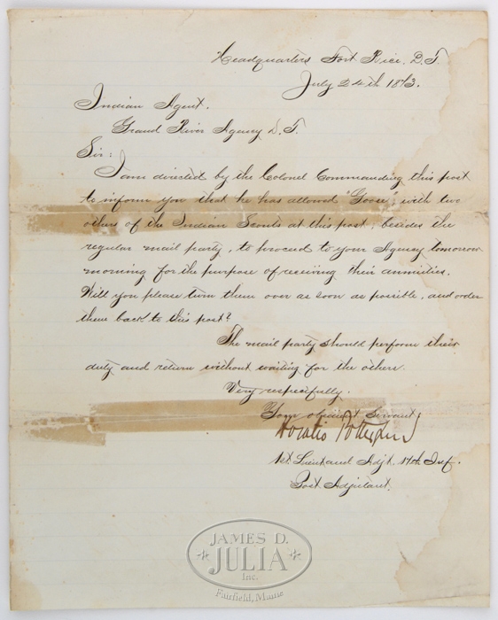 7 MISCELLANEOUS PAPER OBJECTS SOME RELATING TO CUSTER. Many of the objects are printed material. One an interesting handwritten testimonial for the “Faithful Old Government Scout & Guide Goose”. This long flowery testimonial, written by E.H. Allison, in 1899 states that he knew Goose for 32 years. Accompanying is a pass for Strongheart, Chief off the Blackfeet dated 1865, advising passage to Fort Sully, Dakota Territory to meet the Peace Commission. Signed “John G. Clark”. CONDITION: Goose letter broken & repaired at fold. 4-32444 JJ291 (500-1,000)