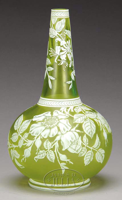 ENGLISH CAMEO VASE. Beautiful cameo vase has white wheel carved roses surrounding the bulbous body of the vase. The translucent green-yellow ground on the body has a slightly frosted finish. The neck of the vase is decorated with white wheel carved honeysuckles against a polished background. The wonderful double pattern vase is finished with a geometric band at the base and top of the neck. SIZE: 11-1/2” t. CONDITION: Very good to excellent with some roughness to inside lip. 5-68443 (3,000-3,500)