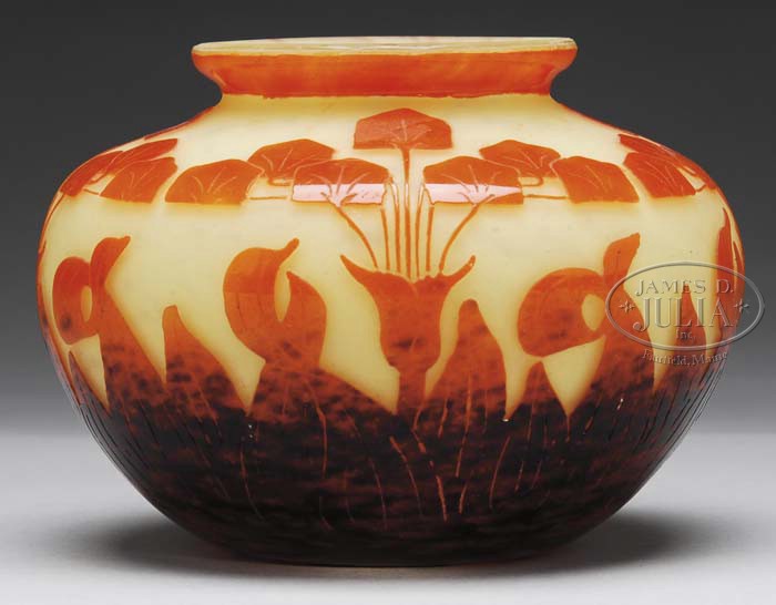 LE VERRE FRANCAIS CAMEO VASE. Bulbous form base ends with a flared lip. The vase begins with a bright lemon yellow mottled ground and is decorated in the Amourettes pattern in vibrant orange receding to deep purple. This is a very nice example of this pattern with its brilliant coloration and minute deco detailing. Signed “Le Verre Francais” in script at bottom.” SIZE: 5″ t x 6″ dia. PROVENANCE: From the Private Collection of Dorothy Lee Jones. CONDITION: Very good to excellent. 5-61722 (700-1,000)