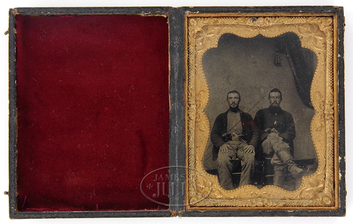 CASED CIVIL WAR TINTYPE. This large approx 4-1/4″ by 3-1/4″ tintype image depicts two soldiers seated in a studio. Both soldiers are bare headed but are garbed in four button sack coats and trousers. Both men have Model 1860 Colt revolvers tucked into their waist belts. The image is in a padded leatherette covered wood case with two brass latches and a brass crest affixed to the front. CONDITION: Very good but the case is missing one of the fastening hooks. 4-32551 DM152 (400-1,000)