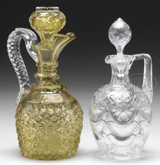 TWO GLASS DECANTERS. 1) Clear glass decanter has intaglio carved floral design around the shoulder with intertwining curved lines carved in the bottom half of the body. Decanter is finished with an applied glass handle and matching hollow blown stopper. 2) Amber cut glass decanter is cut in the daisy and button pattern with three faceted rings surrounding the neck and is finished with a cut clear glass applied handle and matching amber stopper. SIZE: Tallest is 11-1/4″. PROVENANCE: From the Collection of Dorothy-Lee Jones. CONDITION: Both are very good with some minor chips to cut glass pattern on amber decanter. 5-63841 (200-400)