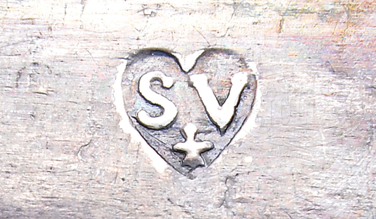 EARLY AMERICAN COIN SILVER PORRINGER BY SAMUEL VERNON, NEWPORT, RI. Bombe bowl with pierced geometric handle which is engraved “H I”. The side of the bowl marked with a heart surrounding “SV” with a fleur-de-lis. Note: Samuel Vernon (1683-1737) was born in Narragansett, the second cousin of Edward Winslow. Admitted as a freeman in 1714, he was very active in civic duties, serving as Justice of the Peace from 1728 and as an assistant in the General Assembly 1729-37. He worked for the colony’s land claims against the Narragansett Indians and neighboring Massachusetts while maintaining a prolific silver shop and other mercantile activities alongside. SIZE: 7-1/2″ with handle. 5-1/4″ d. WEIGHT: 9 tr. oz. PROVENANCE: From a fine Augusta, Maine estate. CONDITION: Some small dents, slightly out of round. Otherwise very good. 9-29347 (800-1,200)