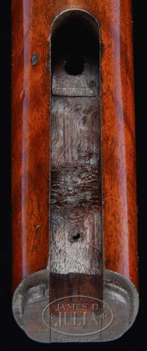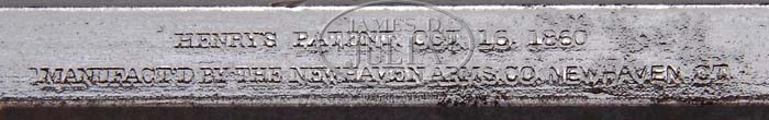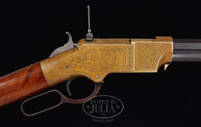 EXTREMELY RARE AND UNUSUAL VERY EARLY PROTOTYPE OR PRE-PRODUCTION HENRY RIFLE. SN None. Cal. 44 RF Henry. Most unusual Henry rifle with 24-1/4″ oct bbl, integral magazine tube, German silver front sight, no provision for a rear sight and a second type 900 yard Henry ladder rear sight mounted atop the receiver in a second dovetail at the rear edge. The front dovetail is filled with a brass slot blank. The bore is rifled in what appears to be Metford style with smooth lands and grooves. The bbl marking on the top flat is located about 2″ forward of the receiver in the usual position and is of the small letter early style. The lever is first Henry type without latch and the hammer is very slightly thicker. It is mounted with very nicely figured flame grain uncheckered American walnut with straight stock and first type Henry brass buttplate with round heel and trapdoor which is substantially thicker than normal Henry trapdoors and the large round recess as is found in very early Henrys. The receiver and buttplate tang are very nicely engraved in Volcanic style consisting of foliate arabesque patterns with feather patterns along the top side flats. Disassembly disclosed no markings whatsoever except that previously mentioned as found on the top flat of the bbl. _____ This rifle, while undoubtedly a Henry, has several dissimilar attributes. Measuring the prominent features of the rifle disclosed the following as compared to another early Henry rifle, SN 3677: receiver thickness over the side plates is .022″ thicker, over the front flats is .029″ thicker, receiver height just in front of the lever is .035″ taller, the receiver length from the front edge to back edge of the hump in front of the hammer is .19″ shorter, the top tang is .516″ longer, .012″ wider and .045″ thinner, the bottom tang is 1.440″ shorter, the buttplate is about .090″ taller and about .017″ wider, the bbl across the flats at the receiver is .002″ thicker, the length of the oct section of the sleeve is .004″ longer, the sight collar is .007″ shorter, the diameters of the round sections of the bbls under the sleeves are identical at .688″, the diameter of the magazine tube is .017″ thinner and the sideplate is .015″ thicker. The lever screws and through-bolt tang screws are completely compatible and interchangeable. The trigger on the subject rifle appear to be slightly thicker but about the same length and slightly less curved. The contour of the receiver is substantially different with a taller radius at the top rear edge and much taller and deeper scallops at the front lower edges. The length of the carriers are identical while the subject carrier is about .011″ narrower. These measurements, while close in most areas, are somewhat dissimilar in others, leaving open to speculation the actual parentage of this rifle. It is the contention of this cataloger that this rifle is an extremely early transitional piece from the Volcanic to the Henry which was somewhat refined before production began. CONDITION: Very fine to extremely fine. The bbl retains about 40% original blue, mostly in the gullets and rotating sleeve with the balance a dark plum patina. Receiver and buttplate are a lovely dark mustard patina with some sharp edge brightness. The lever retains traces of case colors being mostly a dark brown patina while the hammer retains about 95% faded case colors. The stock is sound with light handling and use marks, nicks and scratches, and retains most of its original factory varnish. Mechanics are crisp, bright shiny bore. 4-35144 JR86 (50,000-70,000)