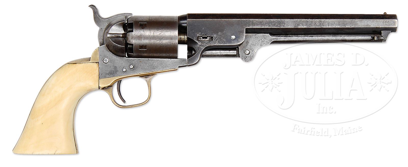 LATE PRODUCTION COLT MODEL 1851 NAVY PERCUSSION REVOLVER. SN 214630. Cal. 36. Usual configuration with 7-1/2″ oct bbl, brass pin front sight and 1-line New-York U.S. America address. Left side of frame has a small “Colts Patent” and the left shoulder of trigger guard has the cal marking. Cyl is usual 6-shots with the Ormsby Naval Battle Scene roll-marking. The 4th type large brass trigger guard and backstrap contain an unnumbered, orig type ivory 1-pc grip. Wedge is a period of use replacement which bears the SN “110905”. Rammer is properly unnumbered. According to Flayderman’s Guide to Antique American Firearms there were 215,348 of these revolvers produced in the period 1850-1873. This being one of the later production pieces, it would not have seen service during the Civil War but almost certainly would have been used on the American Frontier during the great Westward expansion of Manifest Destiny. These revolvers were extremely popular in all facets of American frontier life and famous as well as notorious individuals on both sides of the law were known to have carried and used them very effectively. Wild Bill Hickok carried a matched pair of ’51 Navy Colts and used them with deadly effect, as history records. CONDITION: Very good. Bbl retains 50-60% orig blue with some fine pitting on right side; rammer and handle are mostly a gray patina with the right side of pivot having been lightly cleaned; frame and hammer are mostly a cleaned gray metal patina; cyl is a matching patina and shows about 50% Ormsby Naval Battle Scene; trigger guard and backstrap retain silver in the most sheltered areas with the balance a dark mustard patina; grip shows numerous age lines, mostly on the bottom and left side, with a chip in the left toe and left side of backstrap and retains a wonderful mellow ivory patina; timing needs adjusting, otherwise mechanics are fine; strong bright bore with moderate to heavy pitting. 4-47557 (4,000-7,000)