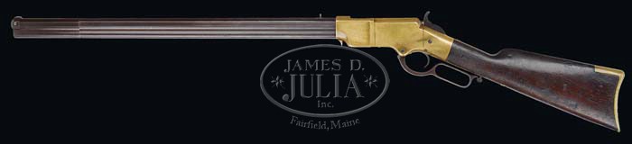 FINE SCARCE MARTIAL HENRY RIFLE. SN 3677. Cal. 44 RF Henry. Usual configuration with 24-1/4″ oct bbl with integral magazine tube, German silver front sight and fixed rear sight. It has the inspector initials “CC” on the right front edge of frame and “c C.G.C.” on the right flat of the bbl joint in front of the receiver and there is the outline of a cartouche on the right side of the wrist. It is mounted with straight grain uncheckered American walnut buttstock with first type brass buttplate with round heel and trap containing an original four piece brass and iron wiping rod. The SN was observed in the usual position over the chamber area of the bbl, left side of the lower tang under the wood, inside the top tang channel of the buttstock and inside the toe of the buttplate. SN is also stamped on the two buttplate screws, however the stock wrist screws, which are original Henry equipment, simply are not numbered and probably never were. The assembly number 434 was observed on top of the bbl under the rotating sleeve, and on rear edge of rotating sleeve. The majority of these rifles were issued to the Third Regiment of Veteran Volunteers which were intended to be an elite unit of shock troops but the war was drawing down by the time they were formed and they only saw duty guard & picket around Washington DC and were disbanded shortly after the war. As a condition of enlistment each of these troopers was allowed to retain his sidearm and rifle upon completing his term of service. CONDITION: Very good to fine. The bbl retains a heavy dark plum patina with a few small spots of discoloration. Receiver and buttplate show moderate wear and retain a dark mustard patina. The stock has a hairline through the bottom buttplate screw hole with numerous nicks, dings and scratches and a couple of light gouges on the right side and retains a hand worn patina with a slightly chipped toe. Mechanics are fine, strong dark bore. 4-35011 JR87 (45,000-60,000)