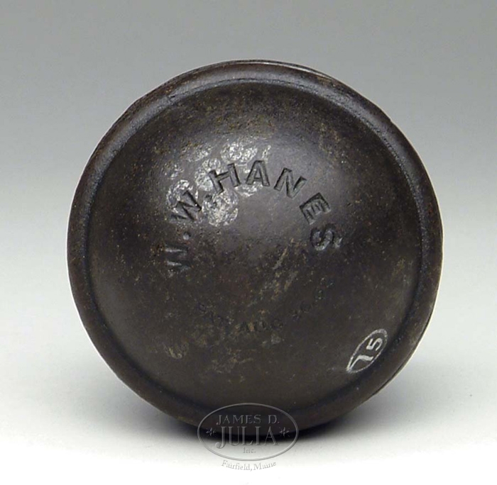 US HANES HAND GRENADE. Non-excavated. Stamped on the side, “W.W. HANES PAT. AUG. 26 62” and on the opposite side “EXCELSIOR”. SIZE: 3.5” diameter. Accompanied by a letter from Norman Flayderman who once owned this grenade in which he considers this the Hanes Patent Grenades among the most rare. CONDITION: Museum quality. 4-55988 JM107 (9,000-12,000)
