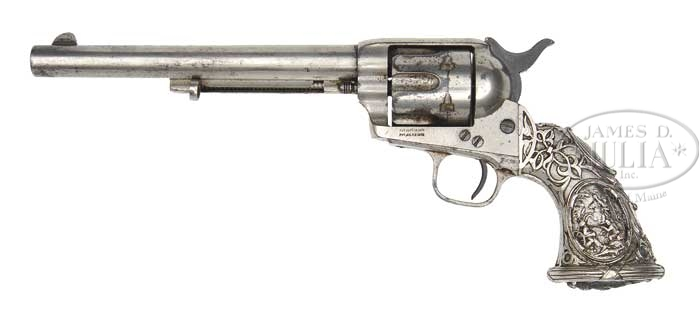 COLT SINGLE ACTION ARMY REVOLVER WITH EXTREMELY RARE ORIGINAL TIFFANY GRIP. SN 21742. Cal. 45 Colt. Nickel finish with 7-1/2″ bbl, slightly thinned front sight and 1-line script letter address with brackets. Left side of frame has 2-line patent dates with the caliber marking on left shoulder of trigger guard. Ejector rod housing is 1st type with bull’s eye ejector rod head. SN was observed on frame & trigger guard with last four digits of SN on bottom of bbl under ejector rod housing and on outer diameter of cylinder. Mounted with an orig heavy silver plated cast metal “TIFFANY” grip that has very highly detailed vignettes of Civil War era military scenes on both sides with a trophy of flags & shield on back strap surmounted by an oval initial panel engraved with the initials “RYA” or some combination thereof. While Tiffany grips are not uncommon on percussion revolvers they are very rarely encountered on single action Army revolvers, especially authentic ones. This grip is authentic in all respects except for possibly having had the eagle butt cap replaced. Bottom edge of the front strap of this revolver has been notched to accommodate the cutout in base of grip. This revolver was produced in 1875 during a period when very few civilian revolvers were being produced with nickel plating only a recently offered process CONDITION: Fine. Overall retains 90-92% milky orig nickel with losses turned to dark patina, especially around muzzle and on cylinder. Hammer retains dark case colors on sides. Grip shows moderate wear with some underlying plating or metal exposed in a couple of very high points. Hammer is not solid in safety notch, otherwise mechanics are fine. Strong bright bore with scattered pitting. 4-40148 JR100 (50,000-90,000)