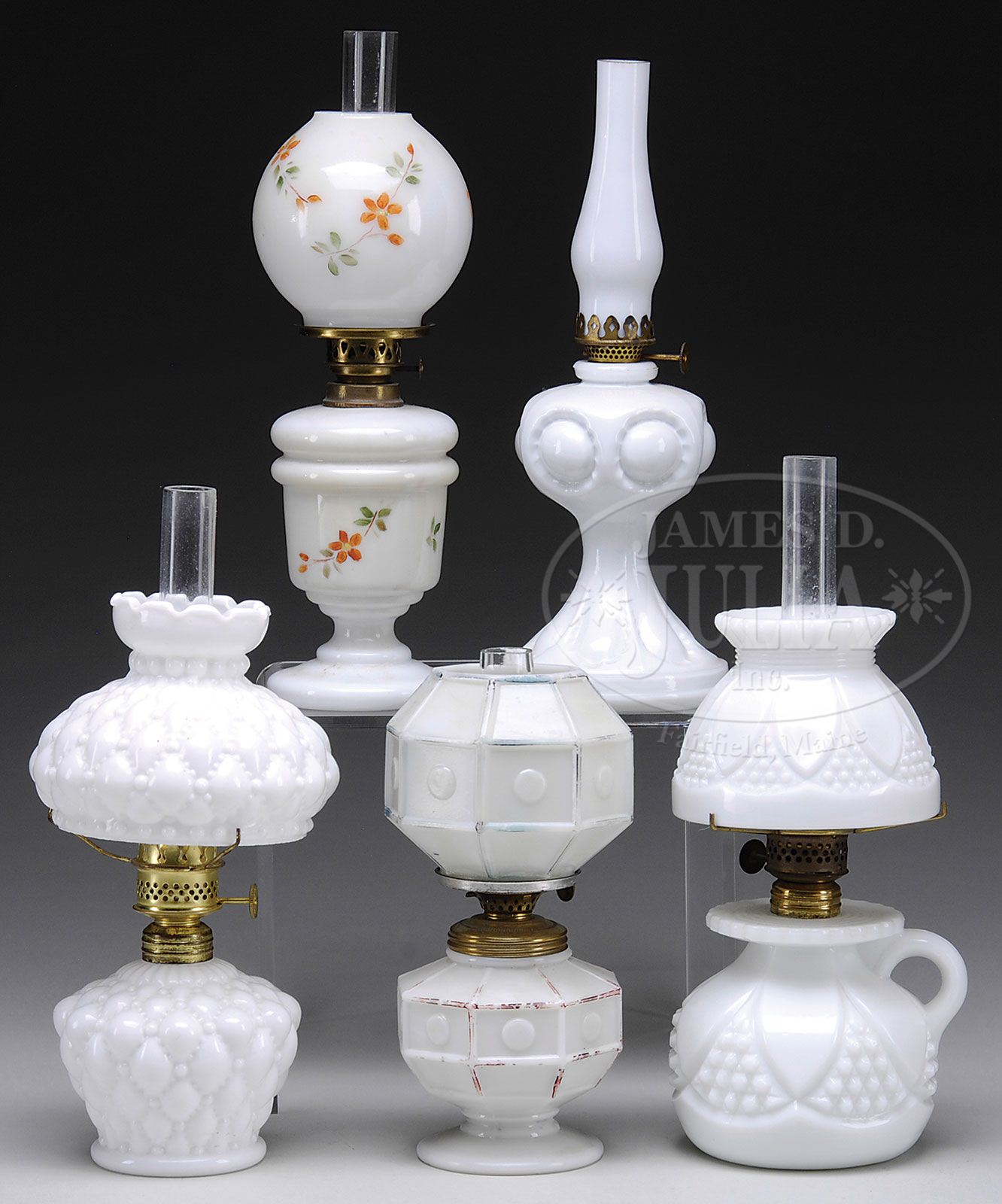 FIVE WHITE MILK GLASS MINI LAMPS. This lot consists of S1-110, S1-190, an Imperial No. 9, a paint decorated base with a replacement ball shade and a quilt pattern lamp. Nutmeg and acorn burners. SIZE: Varies. CONDITION: Generally good. 5-65046, 5-65063-1 (150-250)