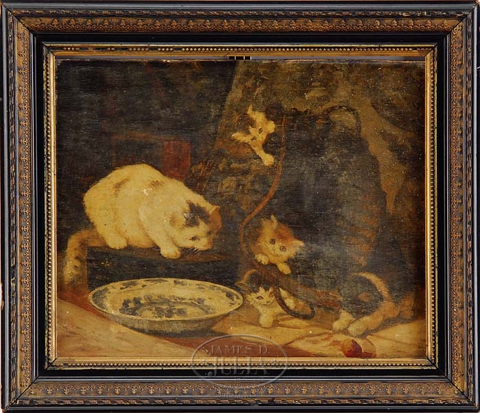 CORNELIUS RAAPHORST (Dutch, 1875-1954) PLAYFUL KITTENS. Oil on wood panel shows a number of kittens and a cat playing with a ball of yarn next to a blue a white bowl. Housed in a good ebony and gilt antique frame. There is a Neumann & Vettin, Amsterdam label fixed to reverse. SIZE: 13-1/4″ x 16-3/4″. CONDITION: Surface dirt, good. 9-92094 (3,000-5,000)