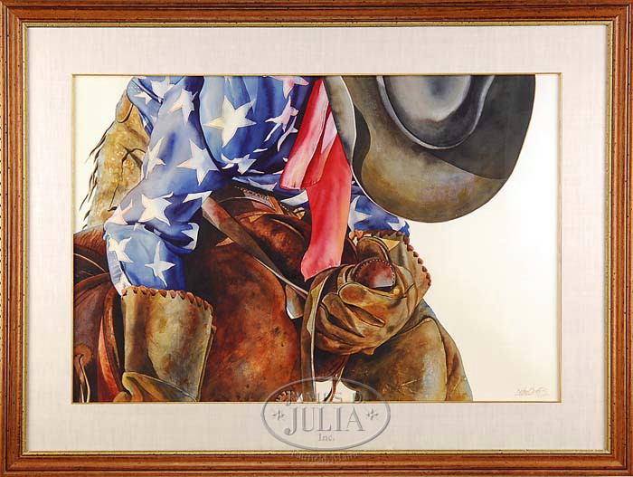 NELSON BOREN (American, 1952-) “WRESTLING WITH MY SADDLE”. Outstanding large watercolor shows a cowboy wearing a U S Flag style shirt and leather chaps with grayish/black hat. He bends over and grasping onto his saddle. Signed lower right. Housed in a molded wood frame with wide linen matte having a gilt liner. This accomplished western artist is represented in the Whitney Museum of Western Art in Cody, WY amongst others and considered one of the finer contemporary western artists of the times. SIZE: 30″ x 44″. PROVENANCE: From a private New Hampshire collector. CONDITION: Very good to excellent. 9-95337 (10,000-15,000)