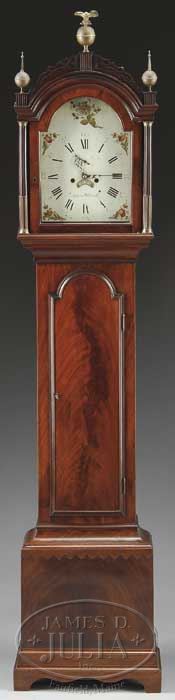 Additional Information: The case is nicely refinished with restoration including crest and some veneer IMPORTANT FEDERAL MAHOGANY ROXBURY TALL CASE CLOCK BY AARON WILLARD. Circa 1810, Boston, Massachusetts. The molded arched bonnet with pierced fretwork beneath brass ball and spire finials. The bonnet with free standing colonnettes with brass stop-fluting. The iron dial with painted floral sprigs, floral spray within the arch. The calendar, time and strike apertures above the name “Aaron Willard” in black all within Roman and Arabic numeral chapter rings centering a sweep seconds subsidiary dial. The case with arched molded door above the cove molded base on plinth raised on bracket feet. Offered with two iron weights, pendulum, winder and door key. SIZE: 90-1/2″ h x 13-1/4″ w of throat x 10″ d. CONDITION: Very good with old polished surfaces. Fretwork and feet appear untouched. Face and movement original. Crack in glass, proper left side panel. 9-25536 (8,000-12,000)