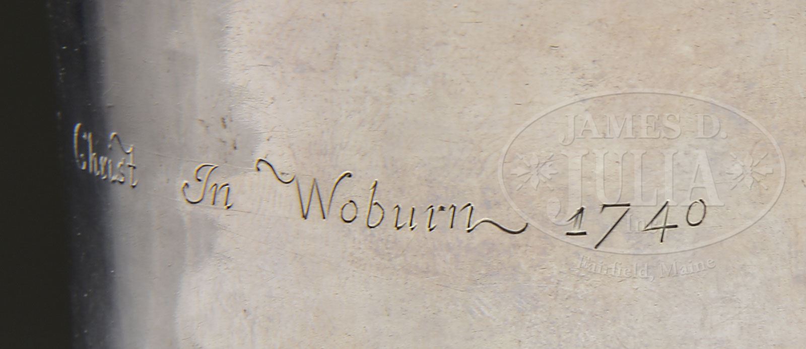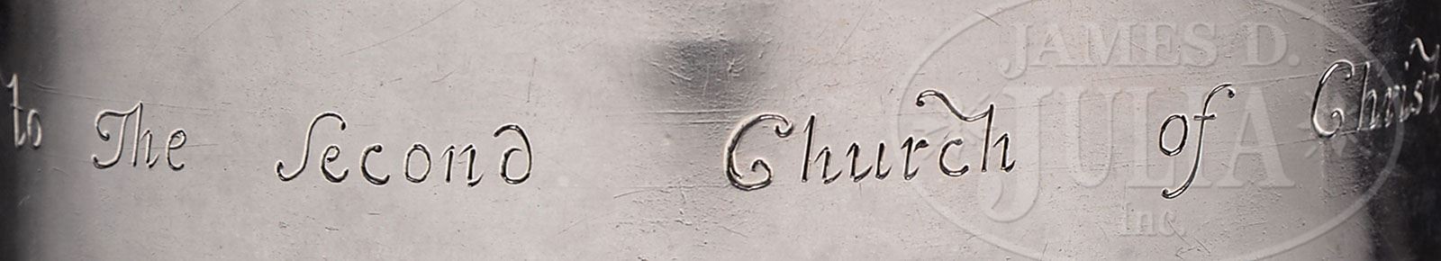 IMPORTANT EARLY AMERICAN SILVER BEAKER. Circa 1740, probably Boston, Massachusetts. Unmarked, maker unknown. The tapering cylindrical beaker with everted rim, inverted foot with stepped molded foot rim. The beaker engraved “The Gift of Mr. Roland Cotton to the Second Church of Christ In Woburn, 1740“. Weight: 7 troy ounces. SIZE: 5-3/4” H. PROVENANCE: Property of First Church, Congregational, Woburn, Massachusetts. Reference: On loan to the Museum of Fine Arts, Boston, Massachusetts circa 1910 for the exhibition of 1911. L-R 14.10. CONDITION: With overall minor light surface scratches and with three small vertical creases in body. Other minor and minimal dents. Foot rim slightly out of round. Otherwise very good. No restoration or damage is noted. 7-74024 (1,000-1,500)