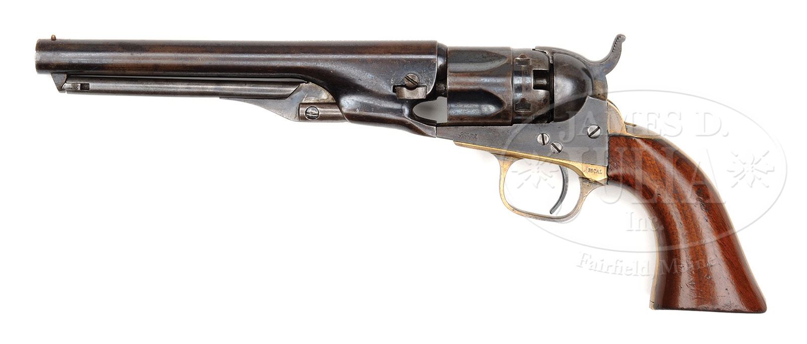 CASED COLT MODEL 1862 POLICE PERCUSSION REVOLVER. SN 14093. Cal. 36. Blue & color case hardened with 6-1/2″ rnd bbl, brass pin front sight and 1-line New-York U.S. America address. Left side of frame has a small “COLTS PATENT”. The silver plated brass trigger guard & backstrap contain a 1-pc varnished walnut grip with last four digits of matching SN in backstrap channel. Cylinder is typical half flutes rebated and has a patent date in one flute. Accompanied by an orig, burgundy velvet lined mahogany casing compartmented in bottom for the revolver, a 2-cavity brass bullet & ball mold, a dbl sided eagle & stars flask, an L-shaped nipple wrench, a packet of five combustible cartridges, a lacquered tin of Eley’s caps, a small pewter oil bottle and cast lead balls. There were only about 28,000 of these scarce revolvers produced in the period 1861-1873. They were very popular during the Civil War for their small size with powerful load and saw extensive hard service throughout the Civil War and later on the American Frontier. They remained in service well into the 1870s until supplanted by the advent of self-contained cartridge revolvers. Very few were cased. Also accompanied by a Bill of Sale from Robin Rapley to Mr. B. DeWolff for this revolver, listed by SN. PROVENANCE: Robin Rapley Collection; B. DeWolff Collection. CONDITION: Fine, all matching including wedge & grip. Bbl retains about 40-50% orig blue with the balance flaked, not worn to a dark patina; there is one spot of pitting on the left side toward the muzzle; frame retains about all of its orig case colors, turned a little dark; hammer retains bright case colors on the sides, faded on rear edge and turned dark on top edge; cylinder retains strong blue in the flutes and in the rebated area with the balance a blue/brown patina; trigger guard & backstrap retain silver in sheltered areas being mostly a dark mustard patina. Grip is sound showing light wear with a few scattered small nicks & scratches and retains most of its orig varnish. Mechanics are fine, strong bore with good shine & moderate pitting. Case has a crack in the lid, otherwise is solid with light handling & storage nicks & scratches and retains most of its orig varnish; interior is very lightly faded with light soil from the revolver; mold is heavily battered with loose hinge; flask has a couple of dents and retains most of its orig brown shellac with light rust on the spring; nipple wrench & other accessories are fine. 4-49246 JR381 (5,000-8,000)