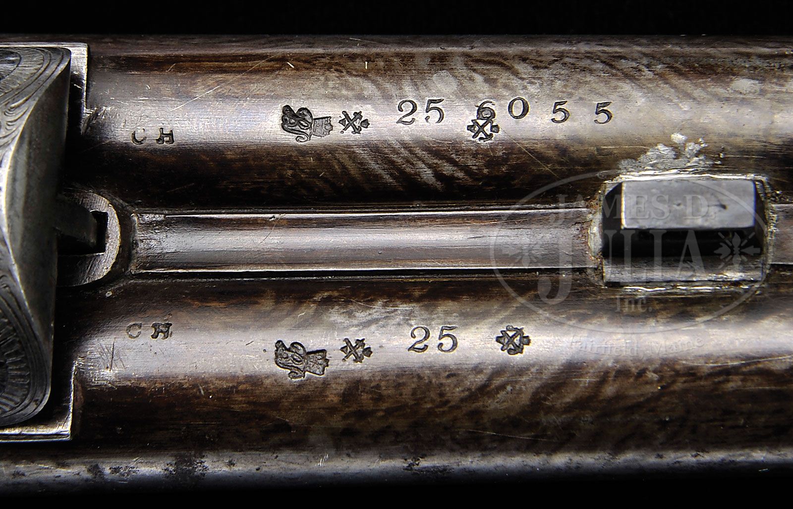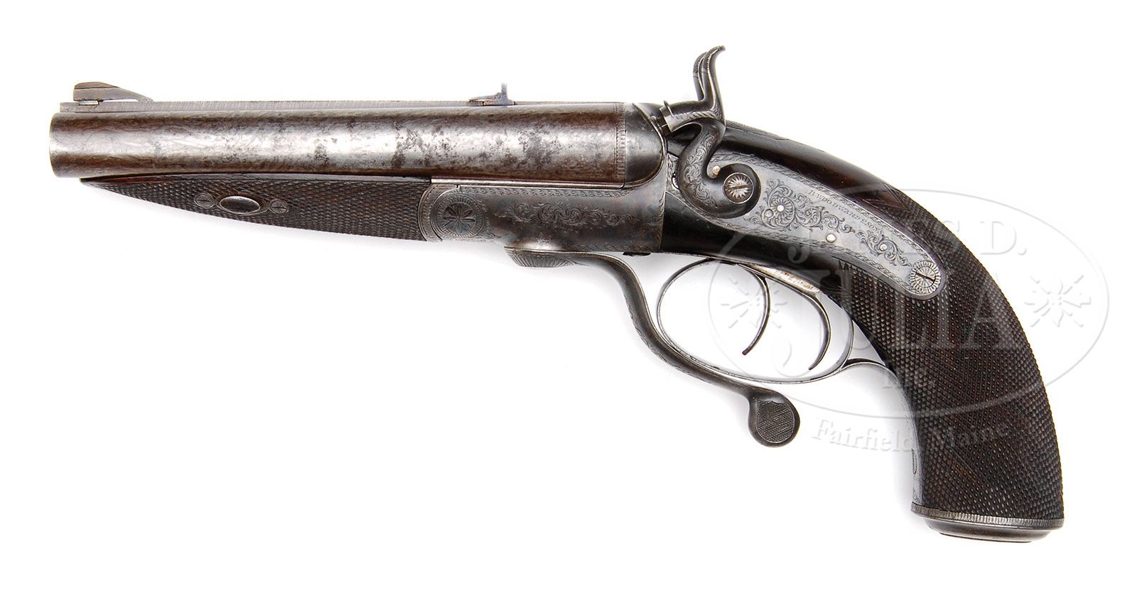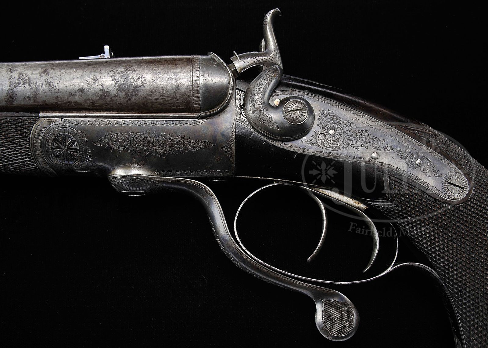 B. WOODWARD & SONS .577 BREECHLOADING HOWDAH PISTOL. SN 6055. (ca 1867) Cal. 577 Snyder. 7″ Enfield rifled laminated steel bbls are engraved “B. Woodward & Sons” on raised top rib mounted with one standing, one folding leaf U-notch rear and ramp front sights. Bottoms of bbls are stamped with Birmingham black powder proofs for 25 bore. Round bodied Jones underlever action has nicely filed fences. Peninsula back action non-rebounding locks have tall spurred, round bodied serpentine hammers. Action and locks are engraved with flourishes of nicely cut open scroll and leaf borders. “B. Woodward & Sons” is at top of each lockplate. Blued trigger guard extends to large steel grip cap, and has SN at grip. Figured European walnut grip stock has coarse wraparound checkering. Matching small forend has inset ebony tip, and fastens to bbl with captive side nail through engraved steel escutcheons. Pistol comes in old leather type attache case. Interior is lined in chamois leather, and is French fitted to pistol. Hinged compartment contains reproduction, archaic looking, turnscrew and cleaning rod. CONDITION: Very fine. Bbls retain 60 – 80% of their orig brown with excellent definition to pattern, most loss due to cleaning of scattered pitting, which is fairly deep in spots. Action and locks retain 80% + orig case hardening color, with some scattered freckling and one or two light pits. Trigger guard retains most of its bright blue. Stocks retain most of their orig finish, checkering lightly worn. Forend tip replaced with epoxy. Bores are excellent, bright and shiny, with sharp rifling throughout. Breech ends of bbls have been engine turned. Action is slightly loose. Bbls are slightly off face. Locks are crisp. Case leather is good, new interior is fine. Any breech loading Howdah pistol is rare, one like this example with lots of orig finish, is especially so. 4-48170 MGM156 (10,000-12,000)