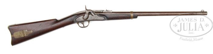 VERY RARE EARLY MERRILL SADDLE RING CARBINE WITH STAPLE FRONT SIGHT. SN 341. Cal. 54. Standard very early 1st Model Merrill carbine with the rare staple front sight and a 3-leaf carbine rear sight with 22-1/8″ rnd bbl. Mounted in an uncheckered straight grain walnut stock with short forearm and a single flat brass band retained with a screw in the bottom. Action area of the stock has raised side panels with a sling bar & ring in the left side. Buttstock is mounted with a 2-pc brass patchbox and a brass carbine buttplate. Trigger guard is also of brass made in two pieces. Lockplate is early type, flat with beveled edges. The Merrill carbine is unique, being breech loading by means of a top lever secured into the rear sight base by means of a knurled edged latch. Releasing the latch allows the lever, which is hinged in the top tang, to be raised & drawn to the rear which withdraws the copper faced breech plug, which allows for a paper cartridge to be inserted. The breech is then closed and the nipple is then capped and firing proceeds. CONDITION: Very good overall. All visible parts matching numbered. Bbl and other metal surfaces are gray/brown with scattered areas of staining and pitting. Staple front sight is completely intact. Lockplate, hammer and breech are gray/brown overall with good, easily discerned markings as can be seen in pictures. Brass has mustard colored patina with old cleaning. Stock is sound, though there are two long cracks in wrist about 3″ long. Crack in front is hairline, crack on reverse extends from escutcheon to breech. There are no discernible cartouches and scattered small dings and scratches and old sanding visible around shoulders. Mechanism mechanically is fine. Nipple is broken, but base remains. 4-46669 (7,000-9,000)