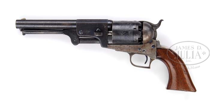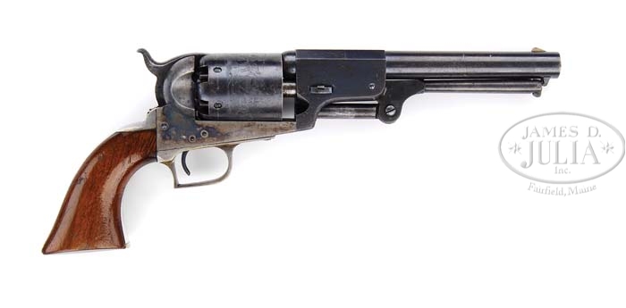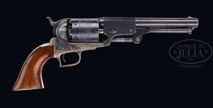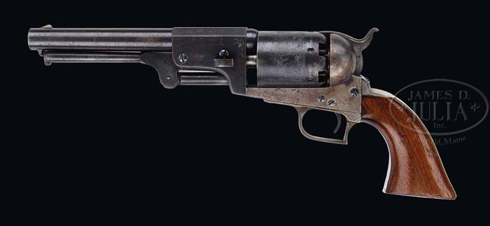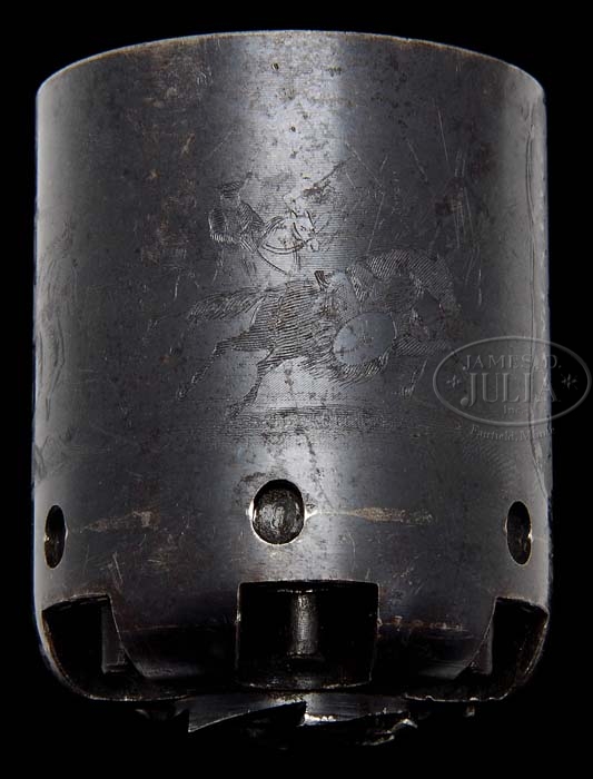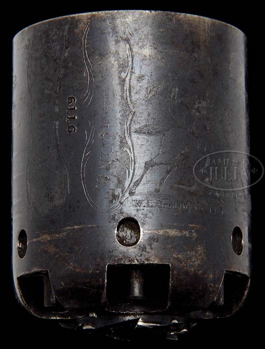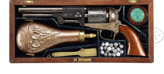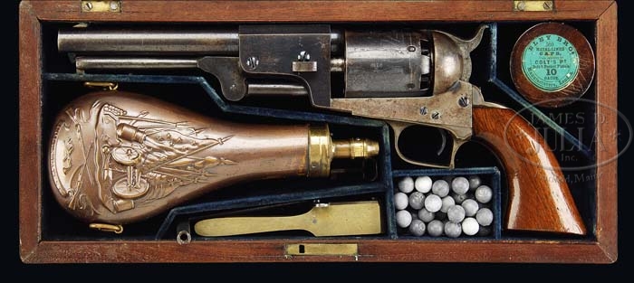 EXTREMELY RARE CASED COLT 1ST MODEL DRAGOON PERCUSSION REVOLVER. SN 6116. Cal. 44. Blue & color case hardened with 7-1/2″ oct to rnd bbl, German silver front sight and address with a bracket at each end that reads from cylinder to muzzle. It has the usual 6-shot cylinder with Ranger/Indian fight scene and oval stop notches with a crisp sgl safety pin. Trigger guard & back strap are silver plated brass with squareback trigger bow, with a fine varnished 1-pc walnut grip that has the last three digits of the SN in pencil in the butt strap channel. Left side of the frame is marked “COLT’S PATENT” over a tiny “U.S.” Front of the trigger guard and front of the frame have a small “o” below the SN with the trigger guard having small “K” and “G” inspector marks. The bbl lug & rammer handle also have the small “O” marks by the serial numbers. Accompanied by an extremely rare orig Colt blue velvet lined mahogany casing, compartmented in the bottom in American-style for the revolver, an orig dbl sided “COLTS PATENT” copper & brass powder flask with plunger top and “COLTS PATENT” on the swinging cover. Edges of the flask have triangle-shaped hangers. Also accompanied by an orig brass 2-cavity mold with bright “COLTS PATENT” sprue cutter, an L-shaped nipple wrench, a lacquered tin of Eley’s caps, several lead balls and an orig functioning key. While these revolvers were produced in fairly large numbers (7,000 in the years 1848-1850) they were virtually all issued and saw hard service in the military or if private purchase saw hard service on the frontier and are rarely ever found with orig finish. Additionally accompanied by an NRA Silver Medal #362 with its case. Also accompanied by a 4-page letter from noted Colt historian & author, R.L. Wilson detailing much of the above information. PROVENANCE: Dr. Joseph A. Murphy Collection; William Locke Collection; Herb Glass Collection; Fred Sweeney Collection. CONDITION: Extraordinarily fine for this model, all matching except wedge which is numbered “484”. Bbl retains about 80-85% orig blue with the flaked, not worn, areas a light patina. Rammer & rammer retain thin case colors, strong on the pivot. Frame retains 60-70% orig case colors, strong & bright on right side, faded to silver on left side, stronger on recoil shield, bright in sheltered areas. Hammer retains about 50% faded case colors. Cyl retains about 90% orig blue with about 98% Ranger/Indian fight scene. Safety pin is crisp. Trigger guard & back strap retain 96-97% strong orig silver plating with most wear on heel. Grip has a gouge in left bottom edge with other light handling & use marks and retains most of its orig varnish. Mechanics are crisp, brilliant shiny bore, possibly unfired. Case has a couple of grain checks in the lid and others in bottom but is basically sound with handling & storage marks and retains most of its orig varnish. Interior is strong & bright with slight fading in bottom and some minor soil with light damage from front sight and hammer spur. Flask & mold are exceptionally fine retaining most of their orig factory finish. Altogether a rare set in exceptional condition. 4-36489 JR128 (200,000-350,000)