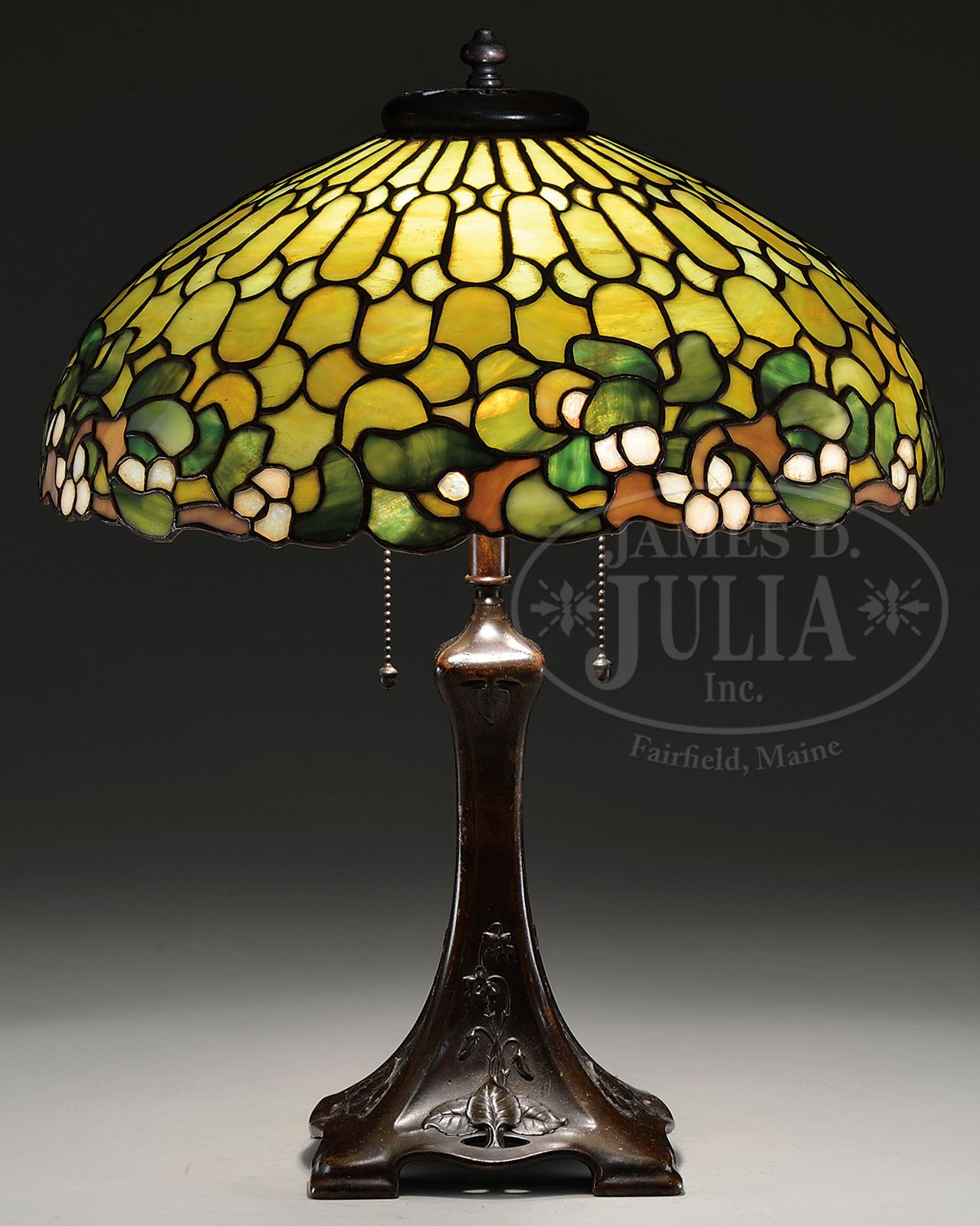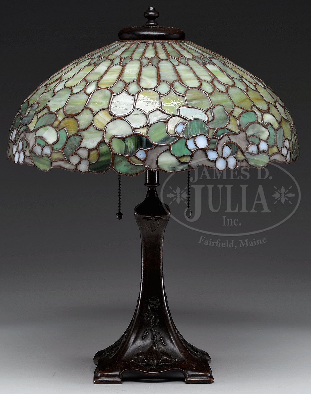 DUFFNER & KIMBERLY MISTLETOE LAMP. Duffner & Kimberly table lamp has leaded glass shade with mistletoe, flowers and berries encircling the bottom of the shade. Mistletoe berries are done in white opalescent glass with nice fire. Design is set against a green and amber striated background of ovals and half circles. Shade rests on a Duffner & Kimberly vase with raised flowers on four sides of the tapering foot. Base is finished with a dark brown patina and topped with a matching heat cap with fleur-de-lis vents. Shade and base are unsigned, but shade may be referenced in Paul Crist’s book Mosaic Shades Volumber II, page 215. SIZE: Shade is 16″ dia. Lamp is 20-1/2″ t. CONDITION: Very good to excellent with some wear to finish on base. 5-67672 (4,000-6,000)