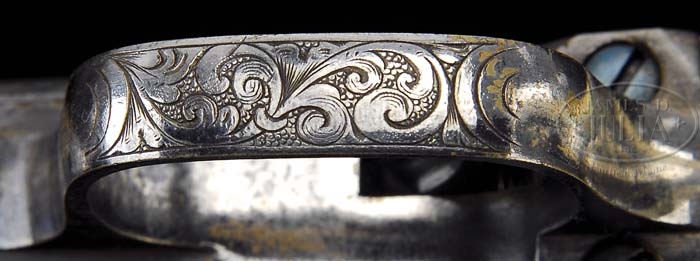 EXTRAORDINARY & SPECTACULAR CASED ENGRAVED PAIR OF COLT MODEL 1862 POLICE PERCUSSION REVOLVERS THAT ALMOST CERTAINLY BELONGED TO MAJ. GEN. JAMES B. MCPHERSON. SN 15859 & 15860. Cal. 36. Extraordinary cased pair that are engraved almost exactly like the cased pair of 1861 Colt Navys inscribed to Gen. McPherson being sold elsewhere in this auction. Not only is the engraving nearly identical, the casing, with slight changes in confirmation, is also identical, even to the color and French fitting. Unfortunately neither the revolvers nor the casing are inscribed. That these revolvers probably belonged to Gen. McPherson is supported by the fact that they were part of the fabulous William M. Locke Collection and are pictured in color adjacent to the 1861’s mentioned above. This set, like the 1861’s, is accorded a lengthy caption in the Locke Collection book, following the caption for the 1861’s. The last sentence of this caption reads “Originally in the McMurdo Silver Collection and follow the same line of acquisition: F. Theodore Dexter to Leonard A. Busby to William Locke.” Given that these two sets of Colts are nearly identically engraved and identically cased and have followed the same trail of ownership through the decades leaves little doubt that they were also a presentation to Gen. McPherson. In a telephone conversation with noted Colt authority, collector and dealer Bob Berryman, he disclosed his recollection as to the origin of these revolvers. He recalled that they first came to light in the McMurdo Silver Collection and he believes they went directly to the William Locke Collection where they were reunited with General McPherson’s cased 1861 Navys. He recalls he purchased them from the Locke collection and sold them to Johny Bassett and later purchased them back from Mr. Bassett. He then sold them to Warren Anderson and they were sold by Butterfield’s Auction company in the 1990s to Doctor Joseph Murphy. Revolvers are described as having 6-1/2″ rnd bbls, pin front sights, small letter 1-line address and with “COLTS PATENT” on left front side of the frame. Left rear web of the trigger guard is marked with the caliber. They are fitted with silver-plated trigger guards & backstraps containing wonderful smooth ivory 1-pc grips. The serial numbers in the four locations on bottoms of the revolvers are all accompanied by a small “I”, indicating factory ivory grips. Engraving from the hand of the master himself, Gustave Young, consists of full coverage on the frames of intertwined foliate arabesque patterns with punch dot background which extend over the bbl lug & bbl and terminate on top, forward of the address. There are matching patterns around the muzzles and on the rammer pivots. Hammers are deluxe engraved with a wolf’s head on each side of the hammer nose, foliate arabesque patterns fully down the sides and feather patterns on the sides of the spurs with hand-cut checkering. Tops of the backstraps have atypical fan patterns for Mr. Young’s engraving with mirror image foliate patterns at the top of the backstrap ears & frames. Backstraps have foliate arabesque patterns at the tops & heels, on the buttstraps & trigger guards with a large empty presentation area on each backstrap. Cylinders are, unusually, engraved with foliate arabesque patterns on the lands between the flutes and fully around the circumference of the rebated areas. While these revolvers were undoubtedly engraved by Gustave Young himself, at the same time, for the same casing, they are not identically engraved. Number “15859” has a scroll terminating in a flower on the left side while on “15860” that same position has a bird’s head. Number “15859” has a dog’s head on the left recoil shield and a lady’s head on the left side of the bbl lug. Number “15860” has a flower blossom and a dog’s head in those areas respectively. The two frames have mirror image engraving on the right sides of the frames with number “15860” having a bird’s head on the right side of the bbl lug and the other no image. The same style of dissimilar patterns were observed on the previously mentioned pair of Model 1861’s. Accompanied by their orig mahogany casing with empty cut corner, rectangular brass plate in the lid and a mortised brass lock in the front with brass escutcheon. Case is burgundy velvet lined and French fitted in the bottom for the two revolvers, two blued 2-cavity molds with “COLT’S PATENT” sprue cutters and marked on the right side “36B”. Also contains a Dixon bag flask, two L-shaped nipple wrenches and two sealed paper-wrapped tins of Eley’s caps and a packet of Colt’s combustible cartridges. This fantastic set appears in two illustrations in full color on p. 61 of Fine Colts The Dr. Joseph A. Murphy Collection, Wilson. As previously mentioned they also appear in color on p. 18 of The Wm M. Locke Collection, Sellers and on p. 159 of the same book. That this set was given such extra attention by Mr. Locke is a testament to his highest regard for them. Clearly the finest cased set of engraved Colt Police Revolvers to come to market in decades, these revolvers are enhances by their presentation to one of the Civil War’s most capable generals, killed in action near Atlanta in 1864. A centerpiece of the William M. Locke Collection for decades, this cased presentation has a long history of admiration into the 21st century. While this cataloger has been unable to turn up any definitive personal biographical data on the presenters; O.N. Cutler and W.C. Wagley, obviously deep personal friends of General McPherson, the general’s distinguished military career and his brave death while riding to his troops in battle is legendary. James Birdseye McPherson was born November 14, 1828 near Clyde, Ohio and entered the U.S. Military Academy at West Point in 1849. He graduated in 1853 first in his class along with his roommate, John Bell Hood, who later would take command