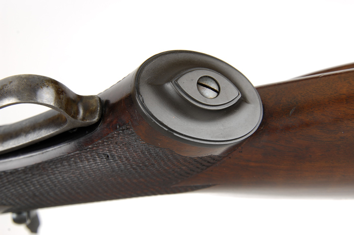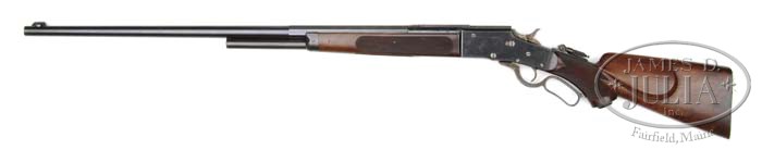 ADDITIONAL INFORMATION: According to Scott Jamieson, noted Bullard scholar, the correct product number of these rare large frames was only 1700, not 12,000 as stated in the catalogue. RARE DELUXE BULLARD MODEL 1886 LEVER ACTION RIFLE. SN 977. Cal. 45 (will accept 45-70). Beautiful deluxe Bullard with 28″ oct to rnd bbl, half magazine, Sheard-style, heavy, ivory bead front sight, missing the bead, no provision for a rear seat and a Lyman combination tang sight. Mounted with very nicely figured European walnut with 3-panel checkered forearm and hard rubber capped pistol grip buttstock with cheekpiece and an unusual, European-style smooth steel shotgun buttplate with widow-peak tang and a large oval trap. Buttstock, under the trap, is not relieved with a recess. Top left side of receiver has the company name, address & patent number with the caliber marking over the receiver ring and the SN on the top tang back of hammer slot. Top right side of receiver is marked “MODEL 1886”. Although the confirmation of the buttstock is not standard for a Bullard, comparison of the checkering patterns is consistent with that found on other deluxe Bullards. Bullard rifles are considered today as the smoothest operating and finest lever action rifles ever produced. They utilized a rack & pinion system to operate the bolt which was extremely smooth and strong. A patent was granted to James Bullard in 1881 with production not beginning until about 1883. According to Flayderman’s Guide to Antique American Firearms there were only 10,000-12,000 of these fine rifles produced by the time they ceased production in 1890. Mr. Bullard, a consummate inventor, was known to have a short attention to business attitude once a product was perfected, then on to something more interesting. He had numerous patents in all sorts of machinery, steam production, steam engines, oil burners and firearms. The Bullard rifle was produced in both large frame & small frame versions along with a musket model and a carbine. Although the design of these rifles was far superior to either the Winchester or Marlin or any other lever action available at that time or since, the stiff competition from Winchester & Marlin with their advanced manufacturing & distribution systems ultimately forced the demise of the Bullard rifle with only these few, noted above, ever having been manufactured. Few are found today with high orig finish. PROVENANCE: Wes Adams Estate Collection. CONDITION: Very fine. Bbl & magazine tube retain 96-98% strong orig finish with a dressed ding on the muzzle, fine sharp edge wear and a few small nicks on the bbl; magazine tube has some light, fine pinprick rust; receiver retains 88-90% glossy orig blue with a few spots of pitting on the top left side and some fine flaking on both sides; lever, hammer & breech block retain bright case colors on sides, turned dark on the outer edges; top tang is also moderately flaked; wood is sound with light nicks, dings & scratches showing light diamond point wear and retains most of its fine orig finish. Mechanics are crisp, very bright shiny bore. 4-44536 JR465 (4,000-7,000)