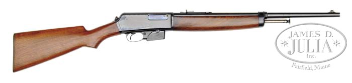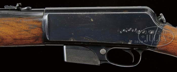 *WINCHESTER MODEL 1910 SL SEMI-AUTO RIFLE. SN 2820. Cal. 401. 20″ tapered rnd bbl, pedestal front with half-nickel front sight, 22 series rear sight with elevator. Left side of bbl marked “MANUFACTURED BY THE WINCHESTER REPEATING ARMS CO./NEW HAVEN. CONN. U.S.A. SELF LOADING MODEL 1910. PAT. AUG. 27./DEC. 10. 1901. FEB. 25. 1902. FEB. 17. DEC. 22. 1903. AUG. 21. 1906. OCT. 30. 1906. – .401 CAL.” Below rear sight “NICKEL STEEL BARREL/ESPECIALLY FOR SMOKELESS POWDER”. Proof marks are found top of bbl and receiver. Standard receiver with takedown knob on rear tang. Mounted with straight grain walnut, uncheckered pistol grip, Winchester hard rubber buttplate, detachable mag marked “.401 CAL” on bottom, standard forend and nosecap with activating rod. PROVENANCE: Dr. Ed Lewis collection. CONDITION: Fine. Bbl retains 98% orig blue with some faint muzzle wear, a couple light nicks and scratches, very fine spotting of faint surface oxidation. Receiver retains 95% orig blue with some spotting of fine surface oxidation and areas flaked and blending with dark patina. Stock is sound with normal minor nicks and dings and retains orig finish blending with hand worn patina. Forend is sound with minor light scratches, orig finish with some small areas that are flaked and blending with hand worn patina. Mechanics are crisp with bright shiny bore. 4-41334 BDT97 (500-800)