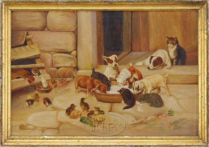 JOSEPHINE STEVER (American, 19th Century) FEEDING TIME. Oil on canvas scene shows a large full milk pan with eight dogs and cats drinking. Another dog and cat looks on while sixteen chicks and one chicken are beside. Signed lower right and date “Xmas 1900″. Reverse has New York canvas stamp. Housed in a lemon gold molded wood frame. SIZE: 12″ x 18”. CONDITION: Very good. 9-91552 (2,200-2,800)