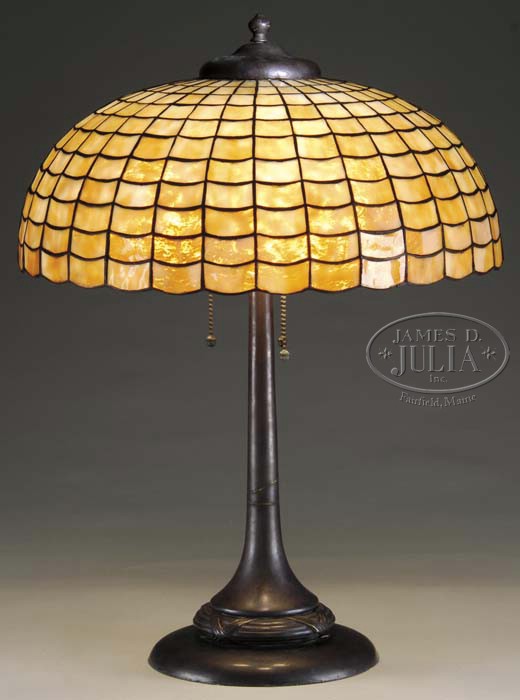 AMERICAN LEADED GLASS TABLE LAMP. Fully leaded shade of small scalloped panels is constructed in a multitude of butterscotch hues, from medium rum to a light cream in every degree imaginable. The glass used is heavily textured. This irregular border shade is supported by a three socket base that has a desirable brown patina finish. The platform base is decorated with a roped coil design and completed with a top cap, finial and three acorn pull chains. Unsigned. SIZE: Shade is 18″ dia. Lamp is 24″ t. CONDITION: Very good to excellent with few, if any hairlines. 5-61464 (3,000-5,000)