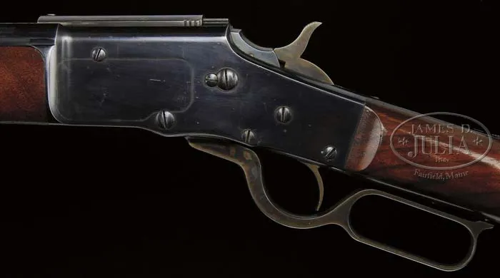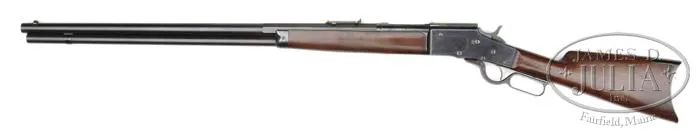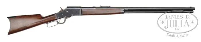 FINE EARLY MODEL 1881 LARGE FRAME BULLARD LEVER ACTION RIFLE. SN 563. Cal. 45 (will accept a 45-70). Standard grade rifle with 26″ oct to rnd bbl, full magazine with half nickel front sight and Winchester Model 1886, 1,200 yard ladder rear sight. Receiver ring is marked “CAL 45” and the SN is stamped behind the hammer slot on the top tang. Left side of rcvr is marked “BULLARD REPEATING ARMS COMPANY / SPRINGFIELD MASS. U.S.A.” and patent date. Mounted with nicely figured, uncheckered, straight grain American walnut with straight grip & crescent steel buttplate. Bullard rifles are considered to be the smoothest operating and finest lever action rifles ever produced. They utilized a rack & pinion system to operate the bolt which was extremely smooth and strong. A patent was granted to James Bullard in 1881 with production not beginning until about 1883. According to Flayderman’s Guide to Antique American Firearms there were only 10,000-12,000 of these fine rifles produced by the time they ceased production in 1890. Mr. Bullard, a consummate inventor, was known to have a short attention to business attitude once a product was perfected, then on to something more interesting. He had numerous patents in all sorts of machinery, steam production, steam engines, oil burners and firearms. The Bullard rifle was produced in both large frame & small frame versions along with a musket model and a carbine. Although the design of these rifles was far superior to either the Winchester or Marlin or any other lever action available at that time or since, the stiff competition from Winchester & Marlin with their advanced manufacturing & distribution systems ultimately forced the demise of the Bullard rifle with only these few, noted above, ever having been manufactured. Few are found today with high orig finish. PROVENANCE: Wes Adams Estate Collection. CONDITION: Extremely fine plus. Bbl & magazine tube retain virtually all of their strong orig factory finish with only the hint of sharp edge wear; forend cap retains about 99% glossy orig blue; receiver & dust cover retain about 98% glossy orig blue with a few tiny nicks and a scratch on the right side; hammer retains strong case colors with the lever showing bright case colors on the sides, moderately faded on outer faces; buttplate shows wear only on heel & toe, retaining about 95% glossy orig blue; wood is sound with a series of small scratches on left side of buttstock and light nicks & scratches elsewhere with some slight dulling on the forearm and overall retains most of its strong orig varnish. Mechanics are crisp, brilliant shiny bore. 4-44534 JR455 (3,000-5,000)