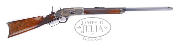 SPECIAL ORDER WINCHESTER 1873 DELUXE LEVER ACTION RIFLE. SN 89320 A. Cal. 44 WCF. 24″ half-rnd bbl, half-magazine, half-nickel front sight, modified to flat top checkered side sporting rear sight. Thick base with finely knurled post tang sight. Mounted with flame grain walnut checkered straight grip stock, crescent butt with trapdoor, 3-pc steel with brass tip wiping rod, deluxe H-style checkered forend. Inspection of lower tang reveals assembly no.”1839″ with matching number in top tang channel of stock & inside toe of butt plate. Accompanied by Cody Firearms Museum letter identifying gun as rifle half oct, plain trigger, checkered stock, case hardened, 14″ pull, 1/2″ drop; received in warehouse May 22, 1882; shipped May 23, 1882, on order no. 32860; return & repair Sept. 22, 1882, order no. 35072. Also noted this exact rifle is pictured in The Winchester Book, by George Madis, on p.164, from the collection of Dr. R. L. Moore, Jr. CONDITION: Fine. Bbl retains 80-85% orig blue with muzzle wear; some thinning & light scratches to rnd portion & sharp edge wear to oct. Receiver has 70% orig thinning case colors, brighter in protected areas. Hammer & lever show most of their orig case colors. Special order 14″ stock is sound, with good checkering, usual nicks & dings and carries hand-worn patina to its orig finish. Forend is solid with usual nicks & dings, with wear in belly area & hand-worn patina with traces of old added finish. Lower tang at SN has minor distortion & SN may have been re-engraved. Mechanics are crisp with bright & shiny bore. 4-35012 BDT82 (17,500-22,500)