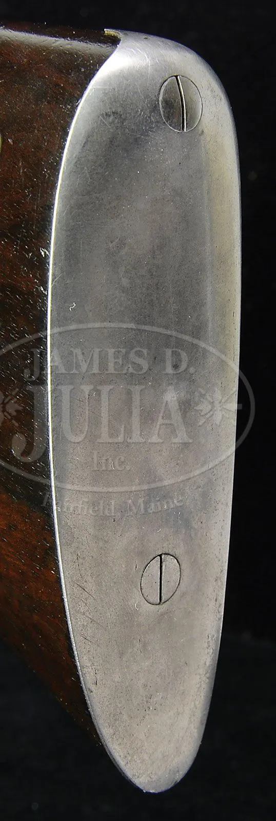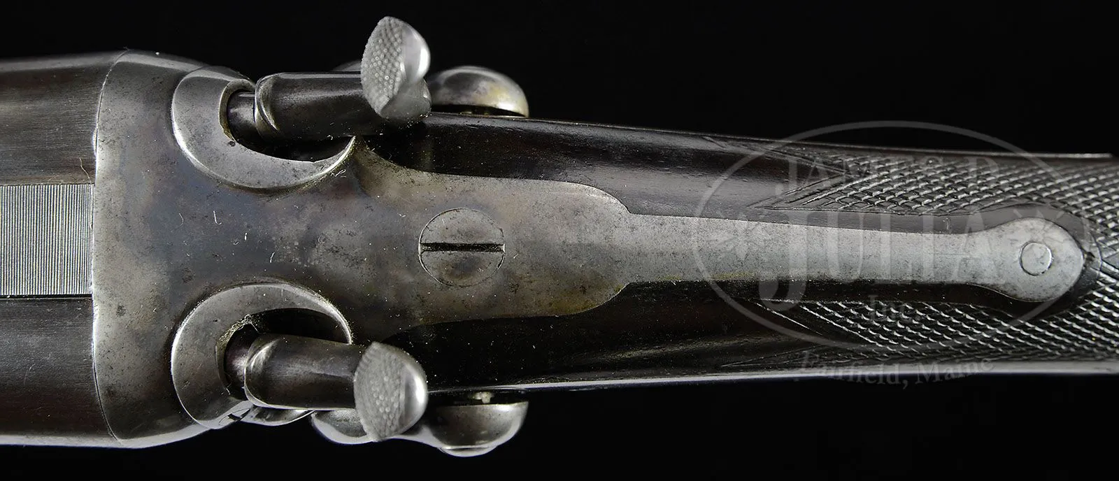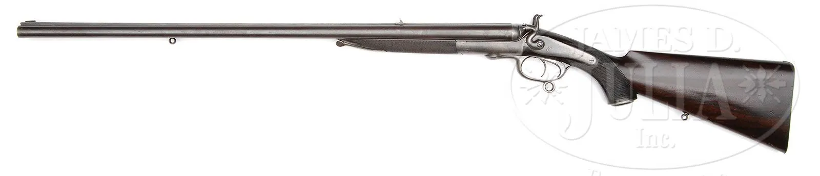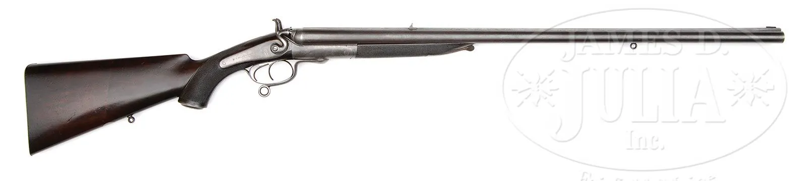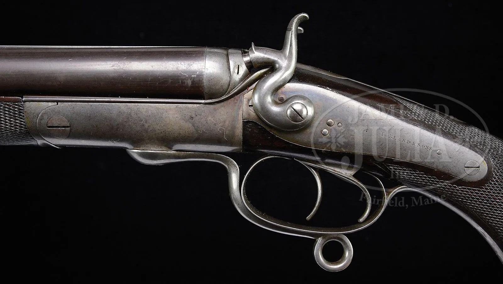 THOMAS BLAND JONES UNDERLEVER DOUBLE EXPRESS RIFLE WITH CASE. SN 10417. (1890) Cal. 577-500 no. 2 BPE. 28″ Steel bbls with full length file cut rib mounted with single standing express rear, and bead front dovetailed into end of rib, are engraved “T. Bland & Sons.” and “430. West Strand. London” on tops. Bottoms of bbls are stamped with Birmingham black powder proofs, “T B & S”, and SNs. Case hardened round bodied receiver with Jones underlever bolt is fitted with non-rebounding peninsula back action locks with round bodied serpentine hammers. Action and locks although nicely filed and shaped, are unadorned. The only engraving is “T. Bland & Sons” on each lockplate, and SN on tang of trigger guard. Nicely veined European walnut full steel capped pistol grip buttstock measures 14-1/2″ over steel buttplate, and features standard point pattern checkering with mullered borders and a sling eye on toe line, along with a vacant silver oval. Matching splinter forend has pivoting bolt release. Drop at heel: approx 2-1/2″, drop at comb: approx 1-3/4″. Weight: 9 lbs. 4 oz. LOP: 14-1/2″. Old leather case with leather reinforcing on corners is newly lined in dark green baize with reproduction Thomas Bland paper label on lid. Case contains round crystal oil bottle and a pair of Kynoch 577 nitro cases cut off to resemble snap caps, along with a new 2-pc brass and rosewood cleaning rod, with some mops and brushes. CONDITION: Very fine. Bbls retain most of their orig blue with some overall freckling and browning. Action and locks retain most of their orig case hardening color, strong where protected, otherwise mottled pewter gray. Stocks retain what appears to be their orig oil finish with numerous marks and scratches, with some oil rubbed in over the years. Checkering is slightly worn. Bores are excellent, with strong rifling throughout, with some light frosting and a few scattered pits at breech ends. Action is very tight. Bbls are on face. Locks are crisp. Case leather is dark with numerous rubs and marks. Newly applied handle and straps are very fine. Interior cloth is excellent. Reproduction label is slightly foxed. A solid working rifle of its day, should be a great shooter today. 4-48142 MGM160 (4,000-6,000)