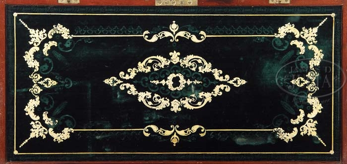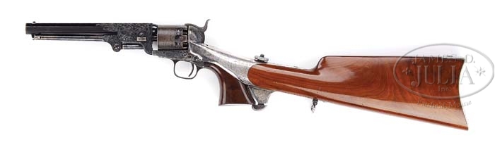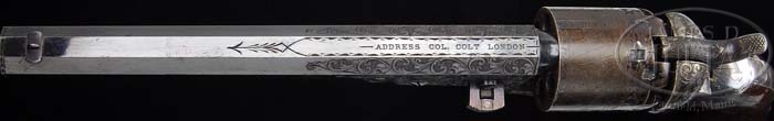 EXTRAORDINARILY RARE CASED ENGRAVED COLT MODEL 1851 LONDON NAVY REVOLVER. SN 90140. Cal. 36. Blue & color case hardened with 7-1/2″ oct bbl, rare dovetail front sight with 1-line London address. Left side of frame has hand engraved “COLT’S PATENT” in a pillow shape. It has silver plated iron trigger guard & back strap containing a highly figured, deluxe burl walnut 1-pc grip with piano varnish finish. Frame is 4-screw type, cut for shoulder stock with flathead hammer screw & extended stock screws. Cylinder alone is British proofed. Revolver is fantastically engraved by Gustave Young in his deluxe coverage of intertwined foliate arabesque patterns with fine punch dot background. Mr. Young has incorporated a dog’s head into one of the scrolls on the left side of the bbl lug and several other scrolls terminate in flower blossoms. Rammer pivot has full coverage matching patterns on the sides and hammer nose has a wolf’s head on each side with foliate arabesque patterns down the sides. Top of the back strap has Mr. Young’s fan pattern with foliate arabesque patterns at the top & heel, on the butt strap & trigger guard. Cylinder has the Ormsby Naval battle scene. All screws are fire-blued. Accompanied by its orig English mahogany casing with gold plated brass bull’s eye concealed handle in the lid, gold washed corner reinforcements and latches. It has a mortised lock in the front, missing its escutcheon and has very deep dust seals around the bottom. Interior is fantastically lined in green velvet with gold embossed foliate patterns inside the lid with other embossed patterns. Bottom is compartmented, American-style, for the revolver, a matching deluxe, highly figured, uncheckered buttstock with silver plated Gustave Young engraved yoke & buttplate, SN 90138. Also accompanied by a Dixon bag flask with silver plated collar, top & spout, a rare silver plated 2-cavity mold with “COLTS PATENT” sprue cutter, an L-shaped nipple wrench, two 500-count lacquered tins of Eley’s caps, a packet of Colt’s combustible cartridges, an orig blued steel cleaning rod, three spare nipples, a spare orig hammer spring and a spare orig trigger/lockbolt spring. Also accompanied by a National Rifle Association Silver Medal #102. Compartment lid covers have gold plated buttons with gold embossed borders. This set is pictured in full color on pp. 42-45 of Fine Colts The Dr. Joseph A. Murphy Collection, Wilson. According to the caption to the referenced Photos, S/N 90137 is fitted & engraved identically giving ‘rise” to the likelihood that the stocks were simply mixed up at the time of engraving or that one owner had both sets and allowed the mix up. PROVENANCE: Dr. Joseph A. Murphy Collection. CONDITION: Extraordinarily fine, all matching including wedge & cyl. Grip was not checked. Bbl retains 97-98% glossy orig factory blue with only faint sharp edge wear and a spot on right side of muzzle. Rammer & handle retain virtually all of their orig bright case colors. Frame & hammer retain about all of their orig bright case colors. Cylinder is flaked, not worn, with about 15% glossy blue remaining and balance a light to medium patina. Overall retains about 98% Ormsby Naval battle scene with all six safety pins crisp. Trigger guard & back strap retain virtually all of their strong orig silver plating. Grip shows wear from the stock yoke, otherwise is crisp with a few minor nicks & slight wear on right side and otherwise retains about all of its orig factory varnish. Mechanics are crisp, bright shiny bore with some fine pitting just in front of the forcing cone. Stock has a few very minor handling & storage marks and retains about all of its orig factory varnish. Yoke retains about 90% orig silver with virtually all of wear on right side from case. Buttplate retains all of its orig silver. Mold retains about all of its orig silver with some fine pimpling. Flask has one dent on one side, otherwise is near perfect with bright fire blue on spring & strong silver plating. Cap boxes are crisp. Case is extremely fine with one crack in lid & a couple of grain checks in bottom and overall retains most of its orig varnish. Lining is extremely fine, strong & bright in lid with a couple of minor wear spots, lightly faded & lightly soiled in bottom with one open divider joint. Altogether an extraordinary set suitable for the highest level of collector. 4-36497 JR137 (250,000-450,000)