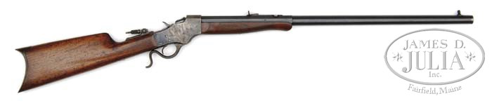 STEVENS MODEL 44 IDEAL SINGLE SHOT. SN 8285. Cal. 25-25. 26″ Half round half oct bbl fitted with standard spring buckhorn rear sight, and folding beech front, is stamped with Stevens name and address along with cal at breech end. Case hardened 44 action has Lyman sight mounted on top tang, and SN on bottom. Plain American walnut buttstock has steel crescent buttplate. Correct orig forend has slight Schnabel. PROVENANCE: Wes Adams Estate Collection. CONDITION: Very fine. Bbl retains 85% + orig blue, silvered at muzzle and high edges, browning slightly overall. Action retains most of its case hardening color, silvered and freckled toward front. Colors at rear are quite vivid. Operating lever is mostly brown, as is tang sight. Stocks retain most of their orig varnish with numerous minor marks and darkening where finish has rubbed through. Bore has strong rifling, somewhat darkened throughout. 4-44675 MGM334 (400-600)