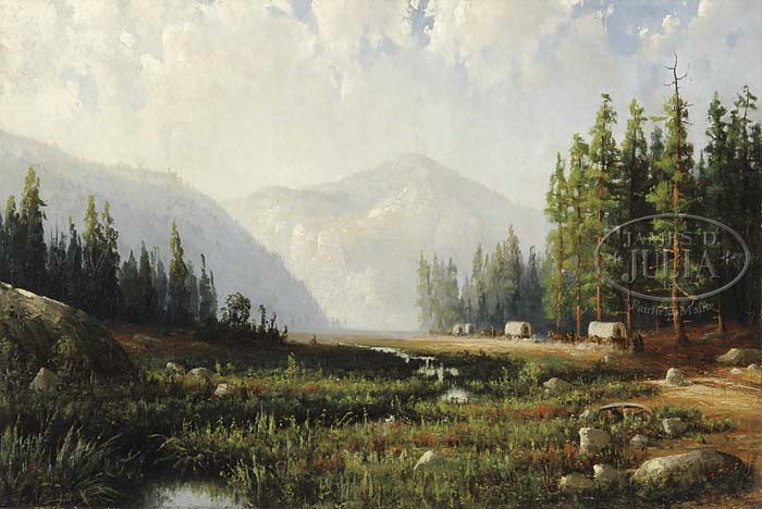 ATTRIBUTED TO THOMAS HILL (American, 1829-1908) WESTERN WAGON TRAIN. Outstanding unframed oil on canvas western scene shows tall mountains in the background with white billowy cloud sky. The foreground shows a valley with grass and water. Along a river bend is seen a wagon train with four covered wagons. SIZE: 21″ x 31″. PROVENANCE: Ex. Hilton Estate Collection of Greenville, Maine. CONDITION: Very good. 9-22792 (6,000-9,000)