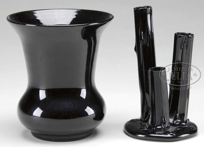 TWO PIECES OF STEUBEN BLACK AMETHYST GLASS. Lot consists of a flaring bulbous vase with ground pontil and a three prong stump vase with original Steuben paper label on underside. SIZE: 6-1/4″ and 6-1/2″ respectively. CONDITION: Very good to excellent. 5-62509 (400-600)