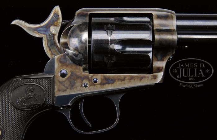 FINE BLACK POWDER COLT FRONTIER SIX SHOOTER SINGLE ACTION ARMY REVOLVER. SN 163700. Cal. 44 WCF (44-40). Blue & color case hardened with 4-3/4″ bbl, full front sight and 2-line address with left side of bbl roll marked “COLT FRONTIER SIX SHOOTER”. There is a tiny “V” and “44” stamped on bottom of bbl, under base pin. Frame is black powder style with screw retained base pin. The transverse pin had been introduced in 1892, three years before this revolver was produced, and was made standard in 1896. Left side of frame has 2-line, 3-patent dates and rampant Colt in a circle. Mounted with rampant Colt hard rubber grips numbered to this revolver. According to consignor’s family legend, this revolver and another from the same shipment being offered in this auction (SN 163624) were given to him by his father, V.I. McDonald, who had purchased them from a Missoula, Montana collector, Jack Weidenfeller, in about 1970. Weidenfeller apparently told the elder McDonald that he had purchased both revolvers from someone in Glasgow, Montana with the history that they had been used as “security arms” in the First National Bank of Glasgow. He also included that the First National Bank of Glasgow originated in 1871 and is currently known as The First Community Bank of Glasgow. Accompanied by a Colt factory letter identifying this revolver, as found, in caliber 44-40 with 4-3/4″ bbl, blue finish, type of stocks not listed and shipped to the C.W. Hackett Hardware Co., St. Paul, MN on Dec. 13, 1895 in a shipment of three same type revolvers. CONDITION: Exceptionally fine plus. Near perfect new, all matching and appears to be unfired. Bbl retains 98-99% strong glossy orig blue with only a tiny wear spots on left edge at muzzle and tip of ejector rod housing. Frame & hammer retain about all of their brilliant orig factory case colors, slightly faded on top strap & top edge of hammer. Cyl retains 96-97% glossy orig blue with a few lightly thinned spots on outer diameter, probably from sliding in a drawer. Overall appears to be new & unfired. Grip frame retains about all of its orig factory blue, slightly thinned on front & back straps. Grips are crisp, showing little or no wear with left side turned chocolate. Hammer is not solid in safety notch, otherwise mechanics are crisp, brilliant new bore. An astounding find with good Western history. 4-40053 JR95 (20,000-25,000)