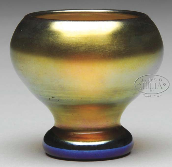 STEUBEN GOLD AURENE CABINET VASE. Iridescent gold finish vase with purple and blue highlights. Signed on underside “Aurene 2641”. SIZE: 2-1/2″ t x 2-5/8″ dia. CONDITION: Very good to excellent. 5-62436 (300-500)