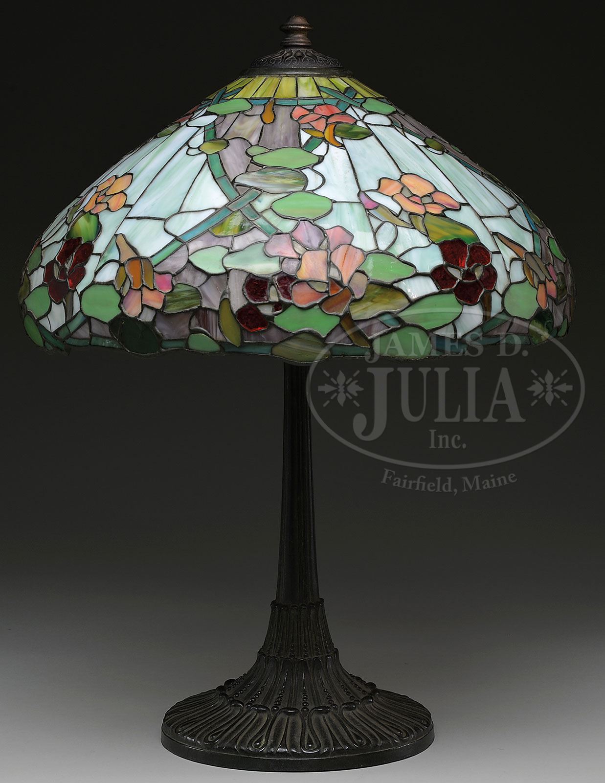 WILKINSON LEADED TABLE LAMP. Wilkinson table lamp has leaded glass shade with floral decoration surrounding the entire shade. Flowers of red, orange, and amber are randomly scattered around the shade with vining leaves clinging to a turquoise blue criss-cross trellis, all set against a background of light green and white striated glass. Shade rests on original Wilkinson base with stylized overlapping leaf design, three-socket cluster, and Wilkinson locking shade ring. The base is finished in a rich brown patina. Base and shade are unsigned. SIZE: Shade is 17-1/2″ dia. Lamp is 23″ t. CONDITION: Very good to excellent with very few, if any, tight hairlines. 5-67053 (5,000-7,000)