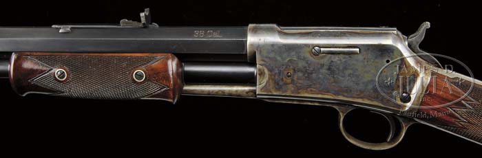 RARE COLOR CASE HARDENED COLT MEDIUM FRAME LIGHTING PUMP ACTION RIFLE. SN 41940. Cal. 38 CLMR (38-40). Beautiful deluxe rifle with 26″ oct to rnd bbl, half magazine, German silver Rocky Mountain front sight and semi-buckhorn rear sight. Top of bbl has the 2-line Colt name & address with patent numbers and has the caliber marking on the top left flat over the chamber area, made without safety except the half cock notch & the hammer. Mounted with extremely beautiful, streaky, honey & chocolate French walnut with checkered dbl schnable 2-pc forearm and straight stock with crescent steel buttplate. Bottom of stock has a small rnd German silver plate engraved in period script “S.P. GUION”. SN was observed on bottom tang and inside top tang under the wood, in pencil inside top tang channel of the buttstock and inside buttplate. Receiver, trigger plate & bottom tang are beautifully color case hardened. The medium frame Colt Lightning rifle was produced in fairly large numbers although not so much so in comparison to comparable Winchesters of the same era. Extremely few are known with color case hardened receivers and of those very few have deluxe checkered wood. PROVENANCE: Wes Adams Estate Collection. CONDITION: Very fine to extremely fine, all matching. Bbl & magazine tube retain virtually all of their strong, orig, factory blue with one small area of scattered rust on left side of bbl about 4″ from the muzzle, otherwise it shows only faint sharp edge wear; receiver, hammer, trigger plate & trigger guard retain just about all of their strong orig case colors, very bright in sheltered areas, lightly to moderately faded elsewhere; top tang is fading with some light surface rust; bottom tang is lightly to moderately faded; wood is sound with a few, very light handling & storage nicks & scratches and a couple of small bruises on each side of buttstock and overall retains about all of its brilliant factory finish; buttplate retains about 50% orig blue with the balance flaked, not worn, to a medium patina. Mechanics are crisp, strong bright bore with moderate pitting. 4-44531 JR334 (15,000-25,000)