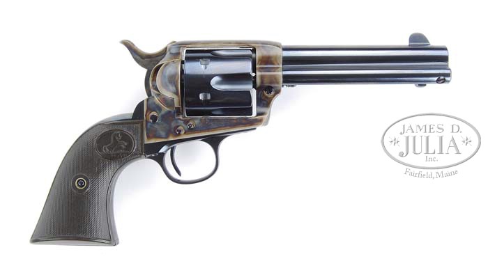 *FINE TURNBULL RESTORED COLT SINGLE ACTION ARMY REVOLVER. SN 203030. Cal. 41 Colt. Blue & case colored with 4-3/4″ bbl, full front sight and 2-line bbl address on top with caliber marking on left side. Left side of frame has 2-line patent dates and rampant Colt in a circle. Mounted with rampant Colt hard rubber grips that are orig unnumbered Colt equipment. Entire revolver has been spectacularly restored by the Doug Turnbull Shop with authentic style Colt blue & case colors. All markings & legends, along with serial numbers have all been re-rolled or re-stamped. CONDITION: As noted, very fine. Retains virtually all of its spectacular restored finish. Blue is strong & bright, case colors are brilliant and screws retain all of their fine fire blue. Grips show moderate heavy wear, turning chocolate. Mechanics are crisp, strong bore with light to moderate pitting. 4-38059 JR196 (1,500-2,500)