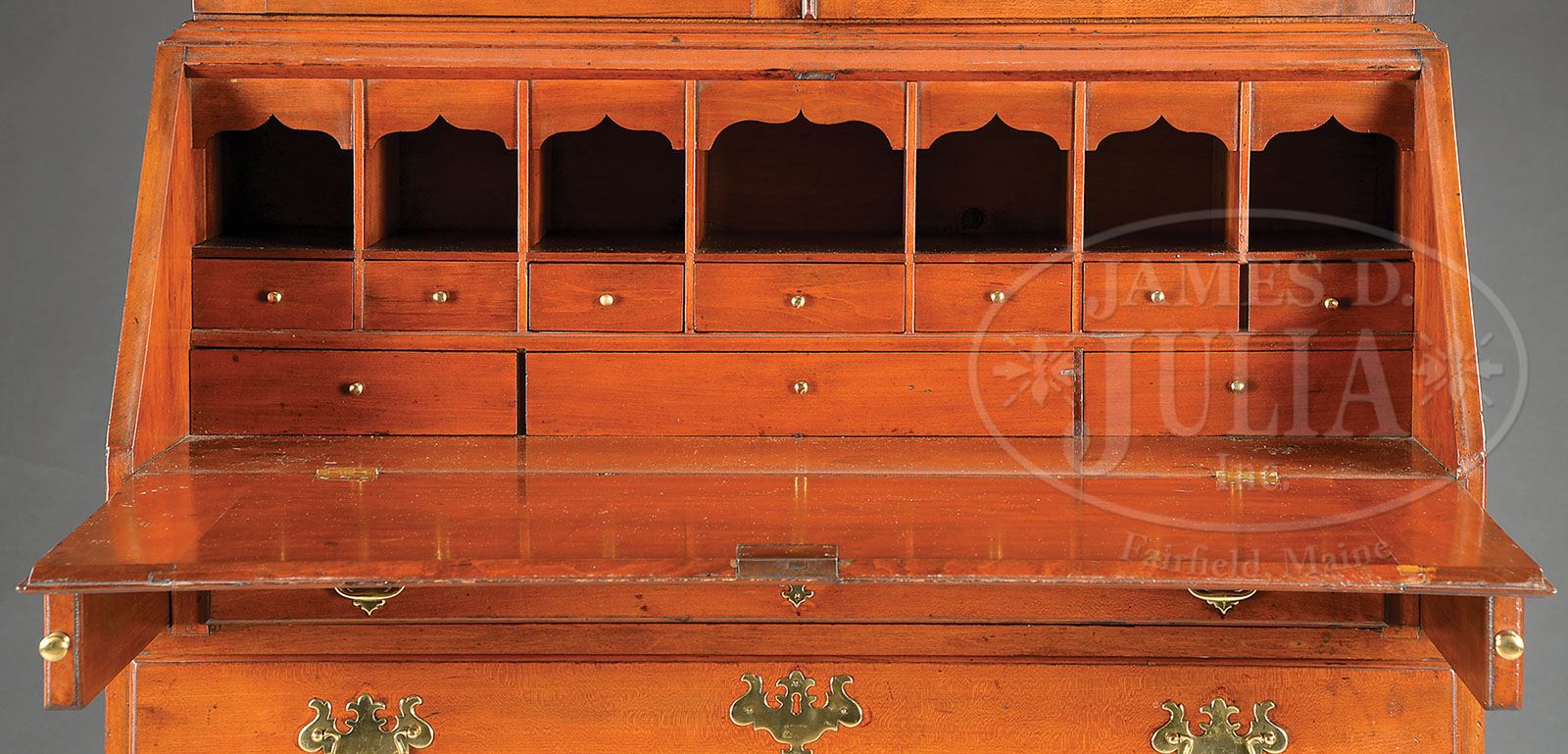 IMPORTANT QUEEN ANNE CHERRY SECRETARY ON FRAME. Third quarter 18th century, Connecticut. In two parts, the upper case with swan’s neck pediment terminating in large carved rosettes, the molded cornice alternating with flame finials on plinths above the plain frieze above a pair of paneled doors opening to an interior fitted with fixed shelves. The lower case with sloping lid opening to an interior fitted with a row of valanced pigeon holes above two rows of document drawers. The lid supported on lopers above four long graduated drawers, all with thumb molded edges fitted to the conforming frame with molded edge. The frame with lobed central pendent raised on four short cabriole legs with scalloped returns on pad feet. SIZE: 85-3/4″ h x 37-3/4″ w x 19-1/2″ d. PROVENANCE: Illustrated “Furniture Treasury,” by Wallace Nutting volume one, figure 685. John S. Walton, Inc. New York City illustrated in the magazine “Antiques,” December, 1962. The Silvermine Tavern antique shops, Norwalk, Connecticut, December, 1947. Copies of this material accompany this lot. CONDITION: Professionally cleaned and repolished, with replaced hardware of the period. Hinges replaced. Very good overall. 9-90413 (10,000-12,000)