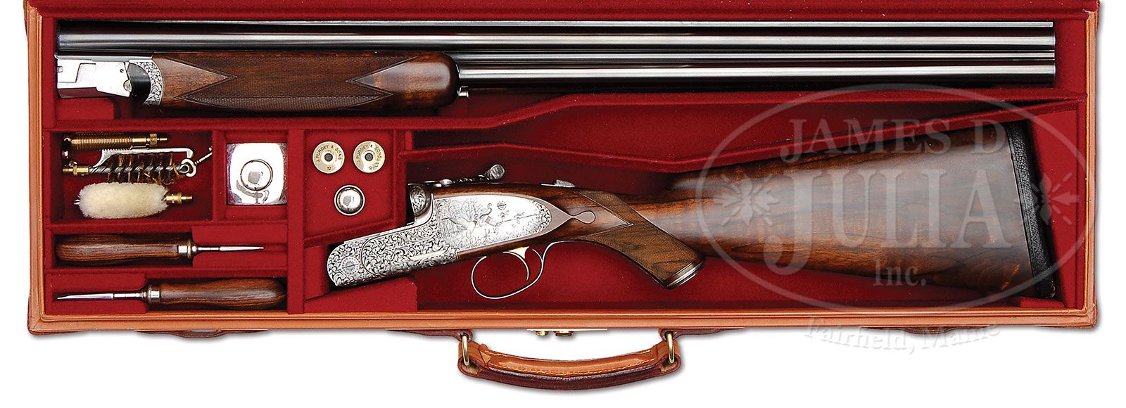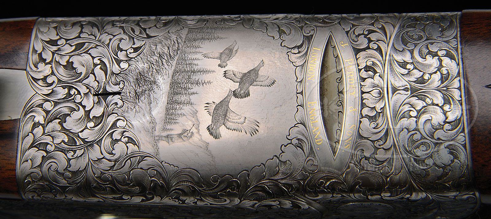 *TRULY EXCEPTIONAL SIMON COGGAN ENGRAVED PURDEY OVER-UNDER SIDELOCK EJECTOR HEAVY GAME GUN WITH CASE. SN 29467. Cal. 12 ga.3″ Chambers. 28″ Nicely struck demi-bloc bbls with full length, solid, file cut rib, are engraved “J. Purdey & Sons. Audley House, South Audley Street, London, England” on left side of top bbl. Bbl flats are stamped with 1995 London nitro proofs for 3″ chambers at 1200 BAR. Bbl makers initials SW (Scott Wood) are on bottom of bottom bbl, which are also stamped with tube numbers “77019” and “20”. Finely filed, rounded bar, Woodward type, low profile OU action features automatic safety (SAFE inlaid in gold), bolstered sides, gold line tumbler end cocking indicators, gold-plated internals, and gold-plated Purdey late type single trigger. Action and lockplates are engraved with exceptionally well cut, large, shaded, scrolled acanthus framing exceptional Bulino scenes of game birds; quattro of mallards are taking wing from cattail swamp with wooded background on left lockplate; pair of pheasant flushing from cover into woods on right; trio of chukar partridge being shot at by hunter in background on bottom of action. “J. Purdey & Sons.” is gold inlaid on scroll flanked device at bottom of each lockplate, and appears again on bottom of action over “London. England.” at front and back of forend iron recess. This exquisite work is by one of the finest engravers of our day, Simon Coggan, who apprenticed to his famous father, Phil, in 1993, and started full time with his own work in 1994, just a year before this gun was proofed. The Bulino scenes are exceptionally fine with wonderful detail, including dramatic cloudy skies. This particular gun is illustrated in an unfinished state on p. 234 of BRITISH GUN ENGRAVING by Douglas Tate. Scroll engraved single beaded trigger guard has SN engraved at grip, and extends to classic steel grip cap, which is also scroll engraved, and inlaid with initials “J. J. G”. Finely marbled and lightly figured European walnut pistol grip buttstock measures 14-3/4″ over 5/8″ brown leather covered pad, and features classic Purdey style drop points and point pattern checkering. The initials “JJG” are individually inlet into toe line. Matching one piece ejector forend has Anson release. Bore diameter: top -.726, bottom -.726. Bore restrictions: top -.020 (mod), bottom -.019 (mod) (Case charge card for this gun reads “Boring of bbls: right lead good 1/2 steel full. Left: good 1/2 steel full). Wall thickness: top-.034, bottom -.034. Drop at heel: 2-1/8″, drop at comb: 1-9/16″. Weight: 7 lbs. 15 oz. LOP: 14-3/4”. Original makers leather case with stitched leather corners has brown canvas leather trimmed outer cover. Interior is lined in burgundy cloth and has gold embossed black leather Purdey label along with charge card for this gun, on lid. Accessories include two piece brass and rosewood cleaning rod with mop, jag, and brush, 12 ga broken case extractor, Purdey marked square oil bottle and snap caps, striker bottle with spare strikers, and two rosewood handled turnscrews, along with the key. CONDITION: Excellent, near new, showing evidence of only very light compassionate use, with only a few of the lightest, almost unnoticeable, marks on wood and metal, mostly on right side of butt. Top grain of leather covering of pad shows some lifting. Bores are excellent, mechanically crisp, with perfectly timed ejectors. Case leather is excellent, with some very slight marks. Outer cover is also excellent, leather trim showing some abrasion, and canvas some fading. Straps and handle are fine. Interior cloth is very fine, showing slight soiling and marks from contact with action and bbls. Labels are excellent. Charge card has a slight smudge. Accessories are excellent. Simply a wonderful gun. 4-47168 MGM35 (45,000-55,000)