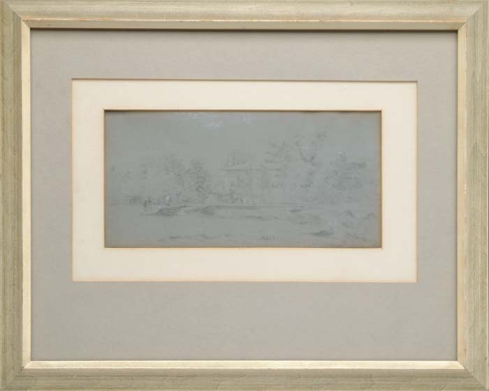 JOSEPH M.W. TURNER (British, 1775-1851) “LAUGTON GREEN 1824”. Sketch on light gray paper shows a house in landscape with figures. Housed in a painted white wood frame with double matte. The back has an attached sheet of paper from Hammer Galleries, New York with title and the following: “From the JMW Turner Collection of the late John Anderson, Jr. Author of The Unknown Turner Founder of the Anderson Galleries Mr. James R. Gilliam Jr.”. PROVENANCE: Found in a northern Connecticut collection. SIGHT SIZE: 4-1/4” x 8-3/4”. CONDITION: Very good. 9-26704 (2,000-4,000)