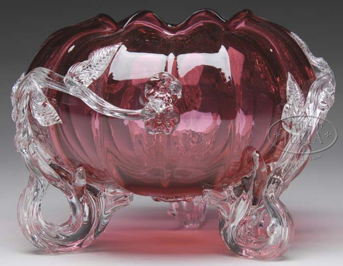 CRANBERRY ART GLASS BOWL. Lovely art glass bowl has vertically ribbed cranberry body with lightly ruffled rim. Bowl is decorated with three applied clear glass feet which curve upward to form a tree limb with applied leaves and flowers. Bowl is unsigned but attributed to Stevens & Williams. SIZE: 5-1/4″ t x 7″ dia. CONDITION: Very good with small area of roughness to edge of one tree limb and small hairline from the making in another limb. 5-63269 (200-300)