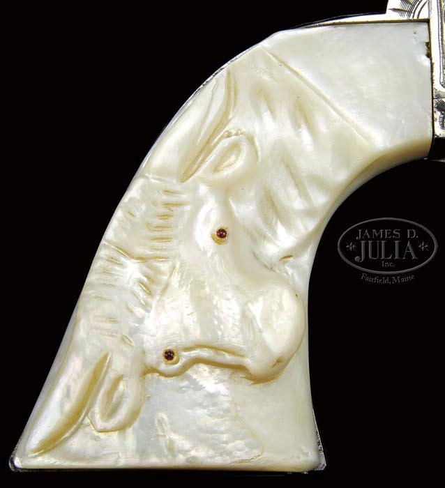 EXCEPTIONAL NIMSCHKE ENGRAVED COLT SINGLE ACTION ARMY REVOLVER. SN 181618. Cal. 45 Colt. Nickel finish with 4-3/4″ bbl, full front sight and 2-line address with caliber marking on left side. Left side of frame has 2-line 3-patent dates and the rampant Colt in a circle beneath the engraving. Mounted with outstanding relief carved ox head pearl grips with ruby eyes. Revolver is engraved in New York style from the Nimschke shop with nearly full coverage foliate arabesque patterns with punch dot background on the frame and hunter stars on each side of the forward frame. Top strap is stamped with six sets of bullseye shaped designs. Foliate arabesque patterns extend nearly the full length of the bbl. Top of back strap is engraved in a Nimschke style fan pattern with geometric patterns down back strap, over the butt strap & trigger guard. Cylinder is engraved with foliate arabesque patterns on the lands between the flutes and with a snake & dot pattern around the rear edge. SN was observed in the usual places, on frame, trigger guard & butt strap with the last three digits of SN on rear face of cylinder. Screws are all beautifully fire blued with a color case hardened hammer. Accompanied by a Colt factory letter identifying this revolver in caliber 45 Colt with 4-3/4″ bbl, rubber stocks and “soft” finish, shipped to Hartley & Graham, New York, NY on Dec. 14, 1898 in a 2-gun shipment. Remarks section states that the word “soft” under finish indicates that this revolver was shipped without final finishing for engraving outside the factory. Grips were obviously supplied by Hartley & Graham. CONDITION: Excellent plus, perhaps unfired. All matching except grips which are unnumbered. Overall retains virtually all of its fine bright nickel finish with only slight muzzle edge wear. Screws retain about all of their bright orig fire blue with the trigger retaining most of its orig fire blue on both sides and back edge with front edge turned plum . Hammer retains about all of its strong orig case colors, fading on top edge. Grips are sound with great fire & color. Mechanics are crisp, bright shiny bore with a few scattered spots of pitting. 4-41894 JR134 (60,000-80,000)