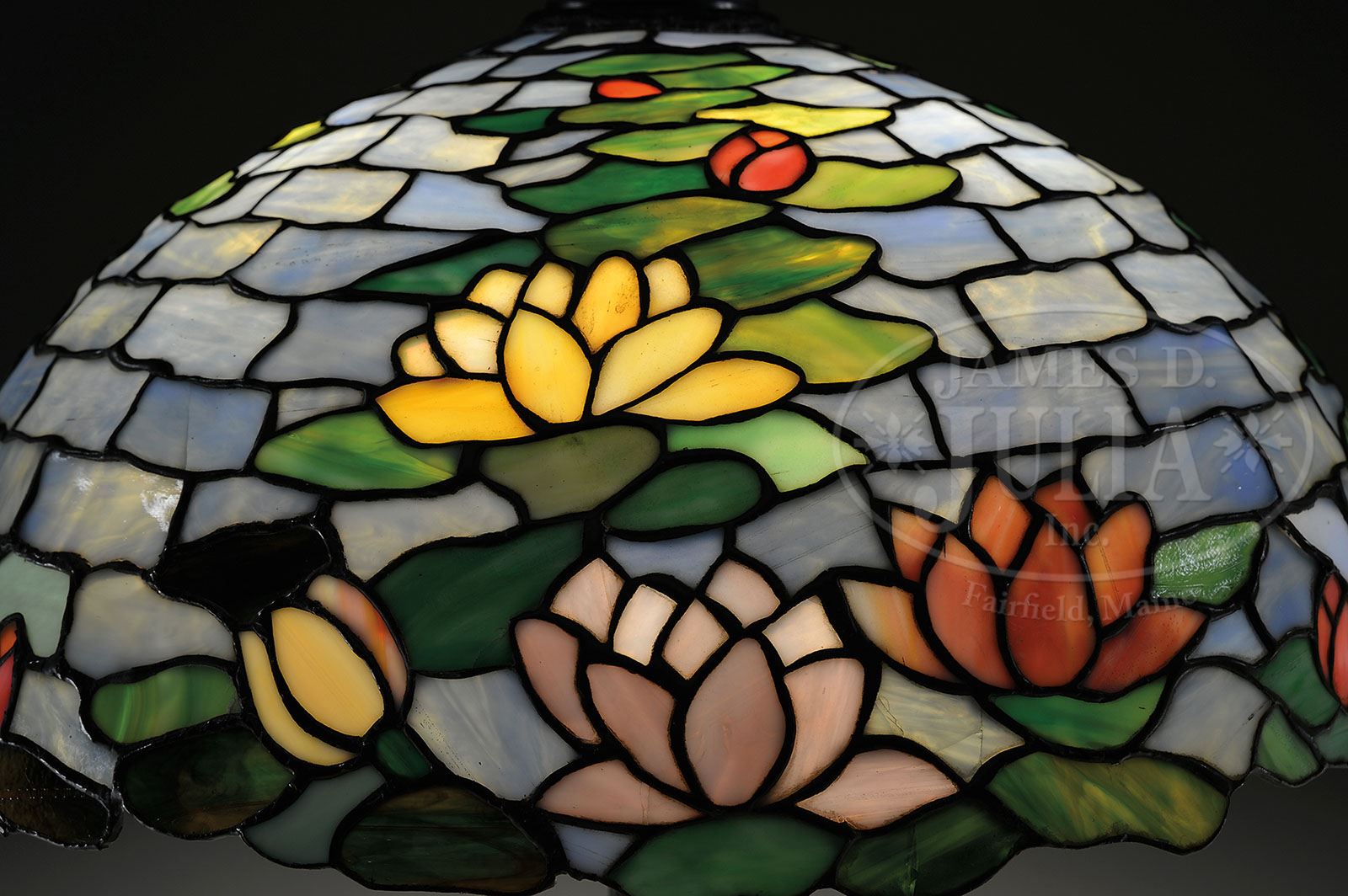 Please Note: The image and description here in our online catalog as well as on our internet bidding platforms is correct. The image and description in our printed catalog is wrong. p> WILKINSON POND LILY TABLE LAMP. Wilkinson table lamp has leaded shade with pink and yellow pond lilies in bloom repeating four times around the shade, all set against an aqua blue background. The shade rests on a Wilkinson base with four pad feet and incised onion design around the platform. The base is finished with a three-socket cluster with acorn pulls and Wilkinson locking heat cap. Shade is unsigned. Base is signed “Wilkinson Co. Brooklyn, NY”. SIZE: Shade is 20-7/8” dia. Lamp is 27-3/4” t. CONDITION: Shade has several tight hairlines, primarily on one side. All have been stabilized on the backside with glue. There is one solder repair around the shade’s aperture. Sockets have been replaced with Hubbel sockets. 7-70390 (2,000-3,000)