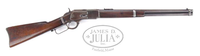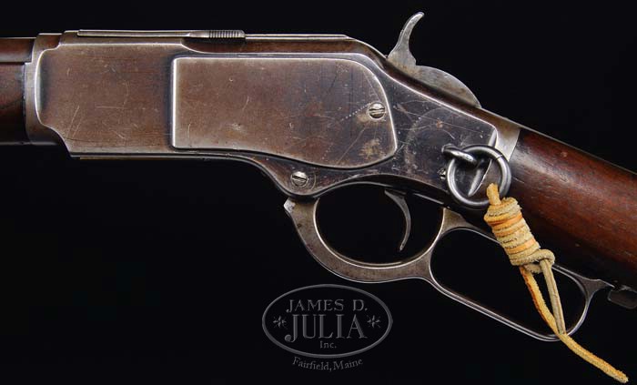 3RD MODEL WINCHESTER 1873 SRC. SN 510993 B. Cal. 38 WCF. 20″ rnd bbl & full magazine with modified square base front sight & usual 73 carbine ladder rear sight. Staple & saddle ring on left side receiver with leather lace. Mounted with straight grain walnut, uncheckered straight grip & carbine butt with trapdoor. CONDITION: Fine. Bbl retains some orig blue in protected areas with balance a mix of brown & silver patina, with matching magazine. Receiver has 20-25% orig blue, mostly in rear & protected areas, with balance a brown patina on sides with silver patina across bottom & sharp edges; has faint saddle ring mark. Hammer has visible colors, but is turning a dark patina. Lever shows only traces of color in protected areas, with balance a dark gray & silver patina. Stock is solid with normal expected nicks & dings and hand-worn patina finish. Forend is sound with a couple of minor chips near receiver, the usual light nicks & dings & carries hand-worn patina finish. Mechanics are crisp; shiny bore with some light scattered pitting. 4-33754 BDT59 (4,500-7,500)