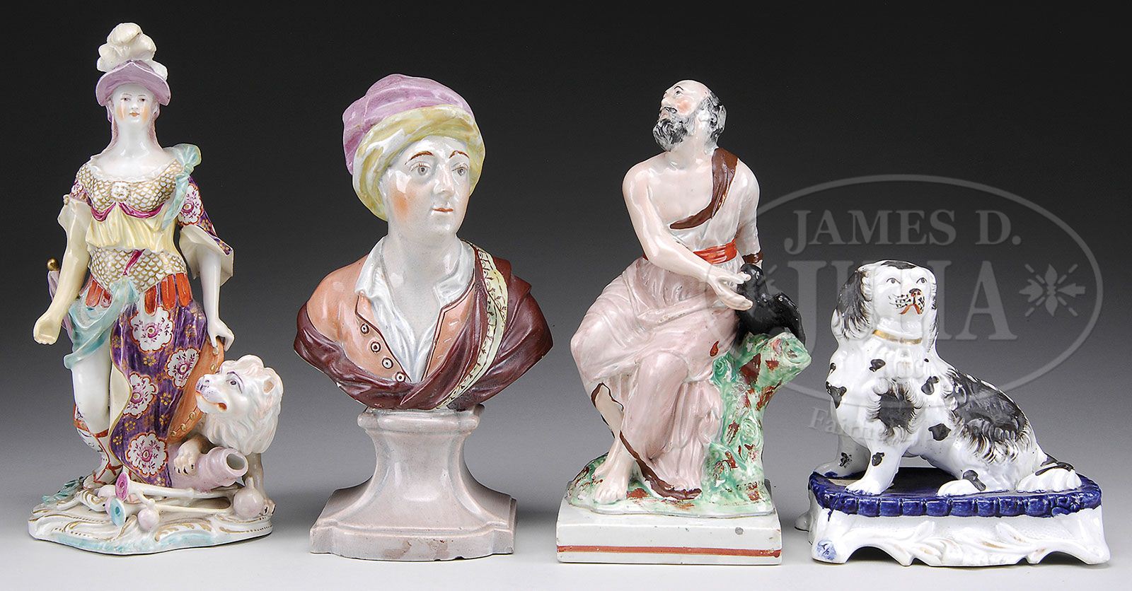 FOUR CREAMWARE FIGURES. Four creamware figures, some possibly Derby, first half of the 19th century or earlier. 1.) figural group modeled after Joan of Arc in polychrome decoration with celestial globe, lion, cannon, horns and sword at feet. 2.) Classical seated and robed figure with raven on square base. 3.) Polychrome decorated bust of a peasant figure on bowed socle base. 4.) Decorated spaniel on rectangular cobalt decorated base. SIZE: 1.) 11″h 2.) 9-3/4″h 3.) 9-3/4″ h; 4.) 6″ h CONDITION: 1.) One horn repaired, otherwise very good; 2.) Minor scattered loss of decoration on base, otherwise very good; 3.) Minor loss to decoration on hat, and a few minor chips; 4.) Gilt decoration worn at base, otherwise, good. 9-28256 (700-900)