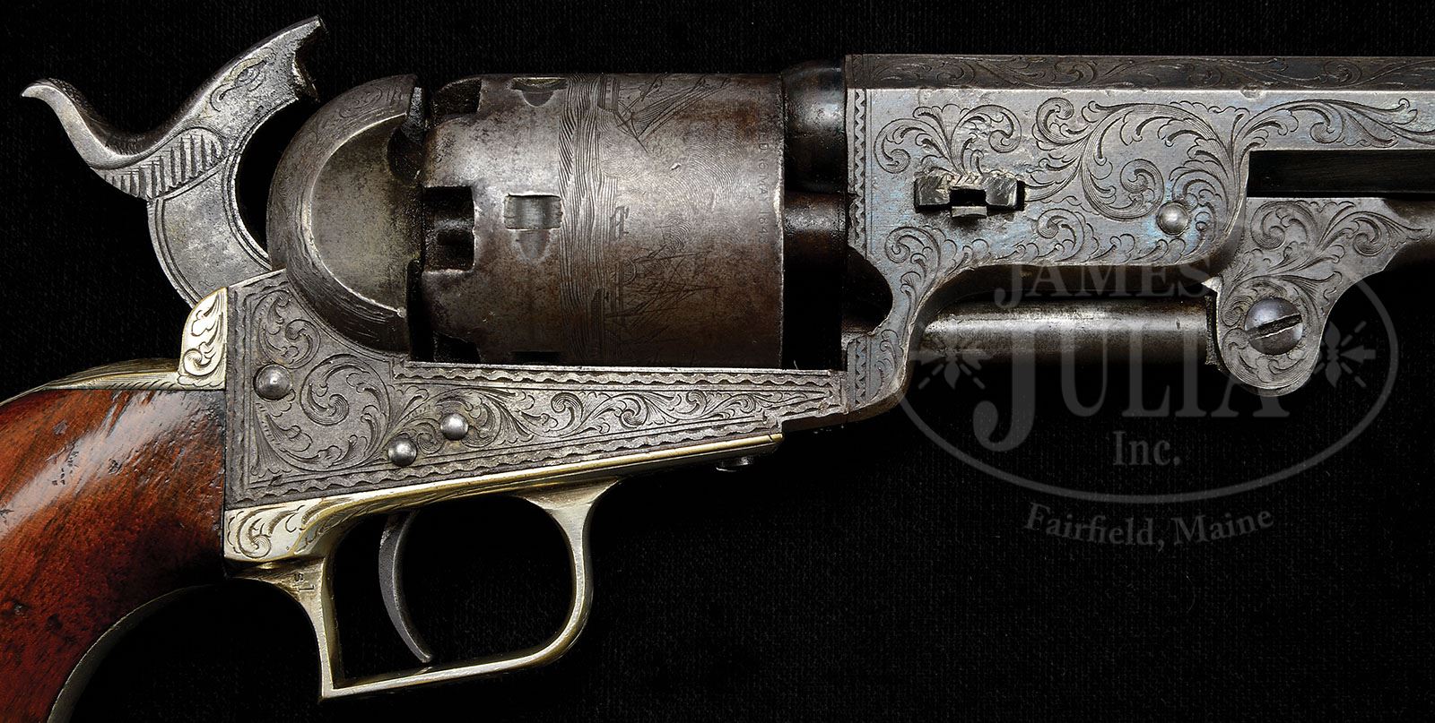 EXTRAORDINARILY RARE CASED AND ENGRAVED COLT FIRST MODEL SQUAREBACK MODEL 1851 NAVY PERCUSSION REVOLVER. SN 344. Cal. .36. Usual configuration with 7-1/2″ oct bbl, pin front sight & 1-line New York City address. Frame has tiny “COLT’S PATENT” on left side. Silver-plated brass trigger guard & backstrap contain varnished 1-pc walnut grip with matching SN in backstrap channel. Cylinder is usual 6 chambers with Ormsby Naval battle scene roll marking & all 6 safety pins mostly serviceable. Revolver is engraved in earliest vine style pattern with wavy border around both sides of frame & recoil shield. Bbl, bbl lug & rammer pivot, along with backstrap, buttstrap & trigger guard are engraved to match. Ends of wedge are also engraved & there is a border around the muzzle. Hammer is engraved with a wolf’s head on each side of nose, dbl line border & long ear-like projections. Top edge of hammer is engraved in fish scale patterns & has small hand-checkered oval on spur. Accompanied by orig blue velvet-lined mahogany casing, compartmented in bottom for the revolver, an angle spout trophy of flags & arms “COLTS PATENT” flask, brass 2-cavity “COLTS PATENT” mold with sprue cutter, full tin of Ely Bros. caps with partial paper wrapping & a few lead bullets & balls. First model Navies are in and of themselves extremely rare, there having been only about 1,250 produced in 1851 with very few surviving today in any configuration or condition. Only a small handful of engraved examples are known & of those, a miniscule number are cased. This revolver, identified by SN appears on pg. 28 of Colt Engraving and again on pg. 20 of The Book of Colt Engraving, Wilson. This revolver has been in several of the finest Colt collections in the country. PROVENANCE: Dr. Robert J. Nelson Collection; Johnny Bassett Collection; George Allen Collection. Michael Leff Estate Collection. CONDITION: Fine to very fine, all matching except wedge which is a proper bottom screw wedge but is not numbered and may be a replacement and retains appropriate orig finish commensurate to the rest of the gun. Bbl retains about 75% strong orig blue with sharp edge wear and thinning on right side. Rammer pivot retains dark case colors. Frame & hammer are mottled gray patina mixed with silvered case colors. Cylinder is gray-brown patina & shows about 95% Ormsby Naval battle scene roll marking. Trigger guard & backstrap retain virtually all of their orig silver-plating. Grip shows light edge wear with light nicks & scratches and retains most of its orig varnish. Mechanics are fine, sharp dark bore. Case has crack across lid & another on bottom, otherwise is sound with handling & storage nicks & scratches and retains most of its orig varnish. Interior is moderately faded & soiled with solid partitions. Flask is very fine, retaining about 90% orig finish. Mold has been cleaned with restored finish on sprue cutter. Cap tin has rust on lid & is missing about 30% of paper wrapping. 4-49634 (80,000-100,000)