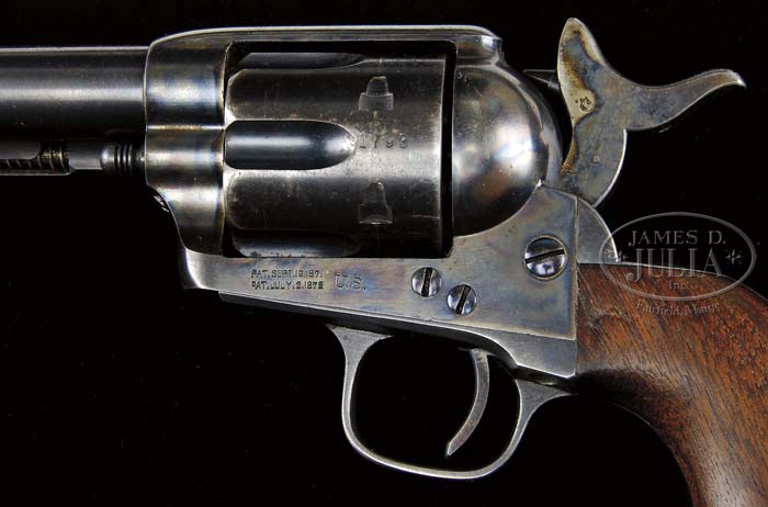 SCARCE INDIAN WARS COLT CAVALRY SINGLE ACTION ARMY REVOLVER. SN 31793. Cal. 45 Colt. Blue & color case hardened with 7-1/2″ bbl, full front sight and scarce 1-line address without dashes (hyphens) at each end and with a period behind the “O” in “Co”. Left side of frame has 2-line patent dates and “U.S.”. Mounted with 1-pc walnut grip that has last four digits of matching SN in backstrap channel. Left side of grip has a crisp “DAL” (Lt. David A. Lyle) inspector cartouche below the date “1876”. Right side has a legible “JTC” (John T. Cleveland) sub-inspector cartouche. Bottom right edge of grip has the “JTC” initials which are also found on bottom of bbl and on cylinder. Bottom of frame has “L.D” (Lewis Draper) sub-inspector initials. Ejector housing is 2nd type with bull’s eye ejector rod head. Last four digits of matching SN are found on bottom of bbl under ejector housing and on cylinder. This revolver was manufactured in Dec. 1876 during the height of the Indian Wars. Cavalry revolvers manufactured & issued during this period are rarely found with high orig finish and orig configuration as most of them saw hard frontier service under harsh conditions. Also, most of them were recalled in the 1890s and early 20th century and converted to artillery configuration with 5-1/2″ bbls. That this revolver remains in orig configuration with high orig finish attests to the fact that it was either issued to a high ranking officer or other official and saw little use or remained in a state militia armory until sold as surplus. Accompanied by a 2-page letter from renowned Colt historian, author & collector, John Kopec, attesting to the authenticity & originality of this revolver and verifying most of the above information. PROVENANCE: Wes Adams Estate Collection. CONDITION: Extremely fine, all matching including cyl & grip. Bbl retains about 95% strong orig blue with muzzle edge wear and holster thinning on left side; bbl retains strong “feathers” on each side of front sight and ejector housing stud; right side of bbl, just forward of ejector housing has about a 1″ long scratch; ejector housing retains about 90% orig blue, strong & bright in gullets, thinned on outer radius; frame retains most of its orig brilliant case colors, thinning to gray on loading gate and very slightly thinned on left recoil shield; hammer retains brilliant case colors on sides & rear edge, moderately faded on top edge; trigger guard retains about all of its strong orig blue including front strap. Backstrap & buttstrap retain bright blue in sheltered areas with body of backstrap & buttstrap candy striped with rust on the heel; cyl retains 75-80% orig blue, strong & bright in flutes, thin on outer diameter with some light spots of surface rust; grip has a chipped right toe with a scrape on right rear side showing light to moderate wear and retains most of its orig oil finish. Mechanics are crisp, bright shiny bore. 4-44679 JR344 (50,000-80,000)
